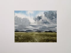 Title: French Hilltop Village Fields Distant Landscape and Clouds Watercolor Artist: Pierre Neveu (French b.1929) Medium: Watercolour on artists paper, unframed Size (H x W): 6.25 x ...