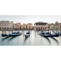 Gerald Berghammer - Color long exposure photography. Gondolas docked on calm water with Venice cityscape, church bell tower and historic buildings. Archival pigment ink print as par...