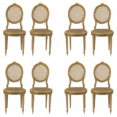 Set of nine French Louis XV style dining chairs (armless side chairs) from the early 20th century. Their curvaceous oak frames outline the upholstered backs and seats carrying the si...