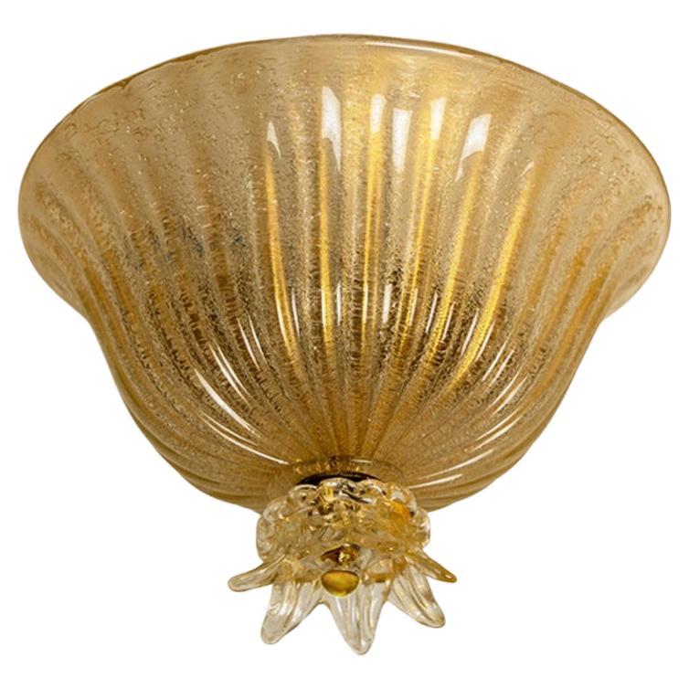 An elegant hand blown Murano glass flush mount by Barovier & Toso. With ochre and clear colored glass. The textured glass refract light beautifully.
