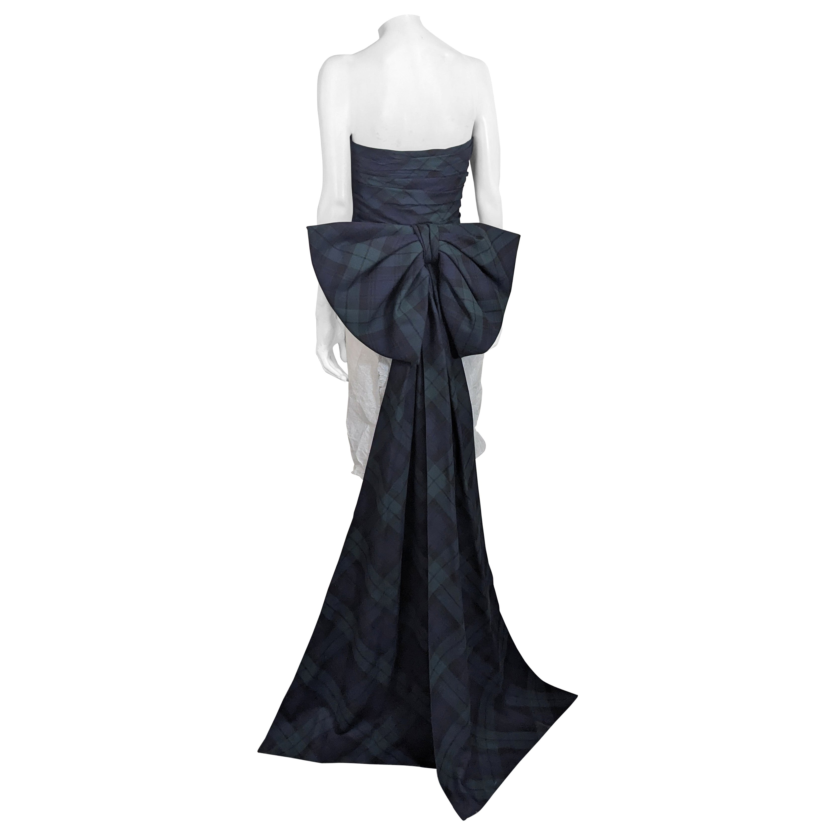 Ralph Lauren Black Watch Tartan Bow Trained Bustier from the Purple Label line. Hand ruched and draped wool on a boned, lined corset with side zipper entry. Attached in back is a mas...