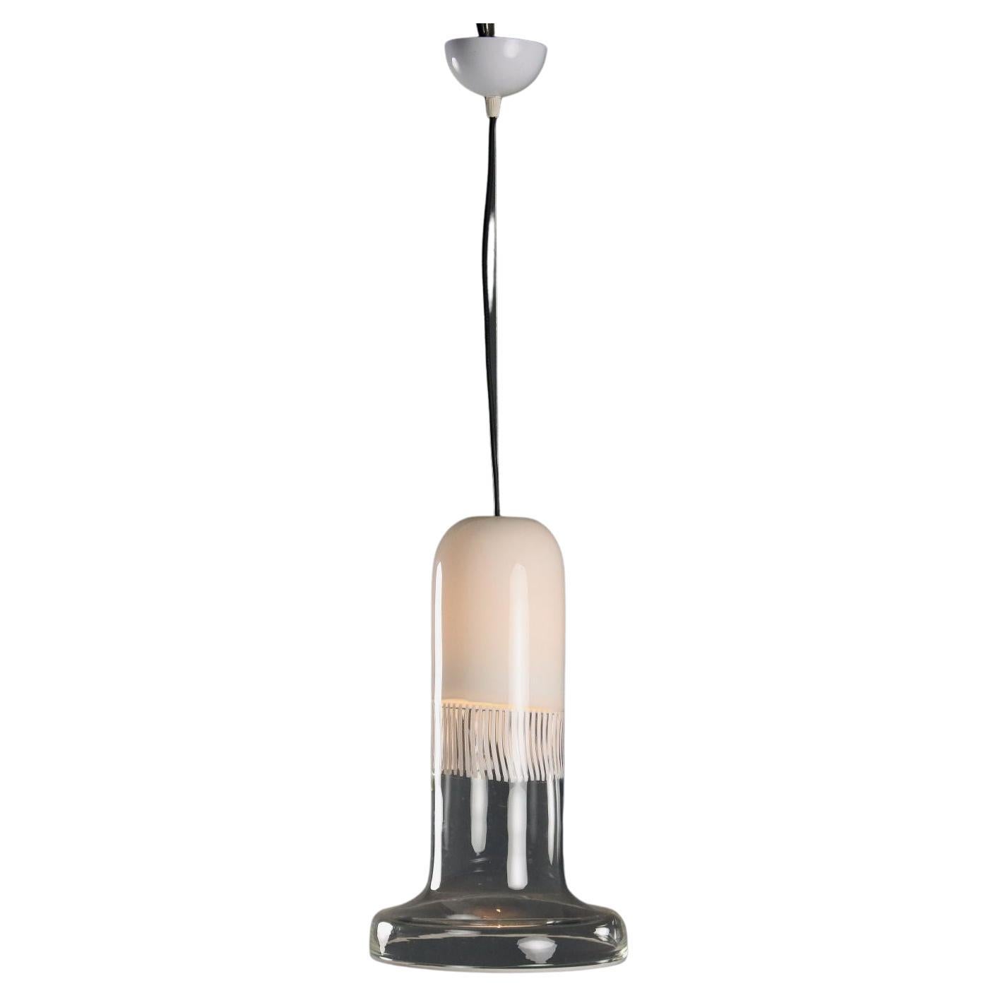 Space Age pendant light manufactured in white and clear hand blown Murano glass signed by Leucos and designed by Roberto Pamio, circa 1970.