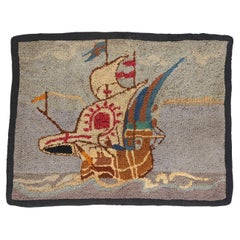 Antique hooked rugs are treasured for their distinctive blend of folk-art creativity and unpretentious simplicity, and this example is particularly evocative. Crafted from repurposed materials and hand-dyed wool, it reflects the ingenuity and artistic spirit of its maker—where everyday utility was transformed into expressive, lasting beauty.