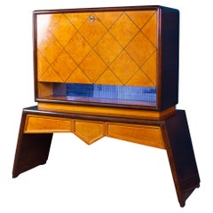 Very elegant Italian Art Deco Mid-Century Modern drinks dry bar cabinet in beautiful veneer walnut briar burl wood, two doors with great wooden decor craftmanship and handles. When o...