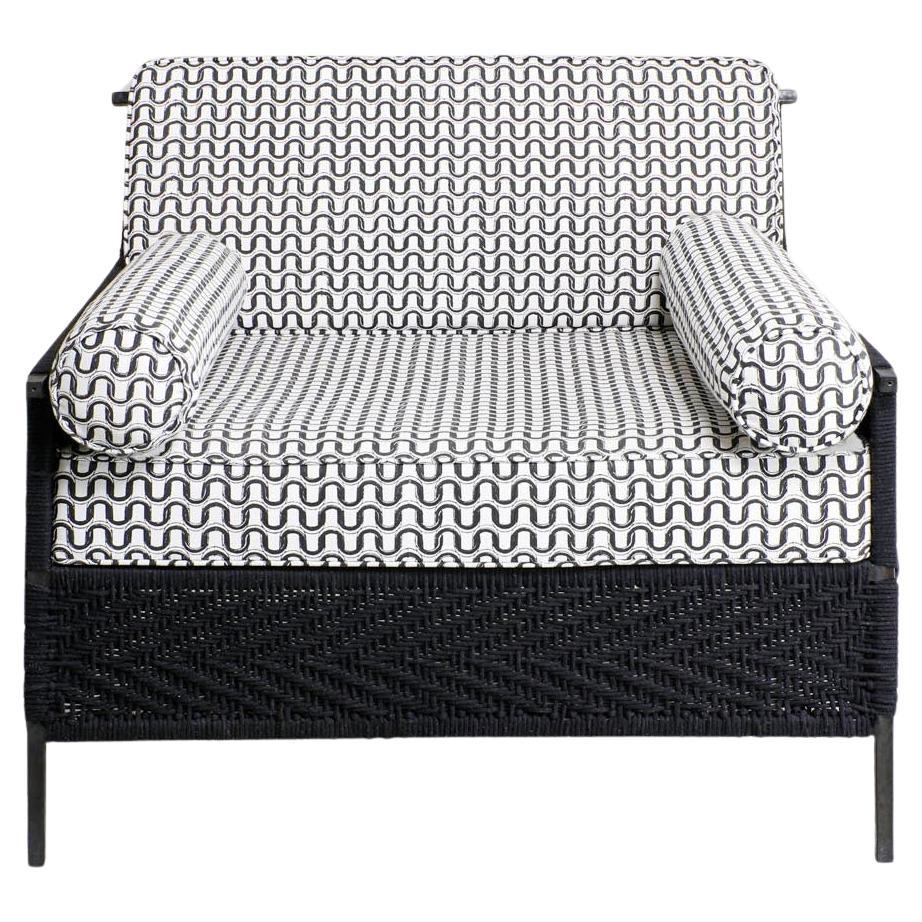 The Geometric Modern armchair exudes understated elegance. Its extra-wide, rectilinear arms are adorned with relaxed throw pillows, all resting on a single, seamless bench seat—chic ...