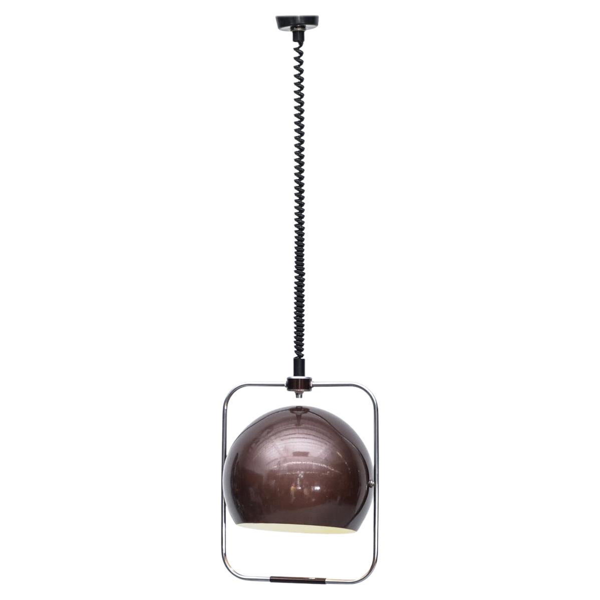 Gepo Pendelleuchte aus der Mitte des Jahrhunderts mit kastanienbrauner, metallisch emaillierter Kugel in einem quadratischen Chromrahmen. Im Baldachin befindet sich ein Flaschenzug, ...