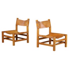 Paddel Sesselpaar von Jean Gillon für Probel, aus cognacfarbenem Leder und Holz Schöne und bequeme Stühle in gutem Zustand mit kaum Verschleiß. Wir haben auch ein passendes Sofa (3-...
