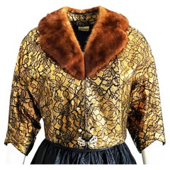 1960er Vintage Metallic Gold + Tan Seidenbrokat Trapez Opernmantel mit 3/4 Ärmeln