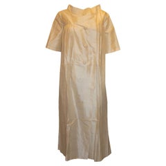 Dieses wahrhaft majestätische Kleid aus cremefarbener Shantung-Seide aus den 1960er Jahren und der dazugehörige Mantel sind mit silberfarbenen Glasperlen, silberfarbenen Strassstein...