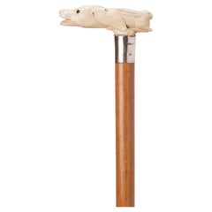 Stark strukturierter Hirschhorngriff, Spazierstock aus der Jahrhundertwende 19. Jahrhundert mit rundem Nussbaumschaft in originaler Ausführung und breitem 1 3/16" Silberband, das um ...