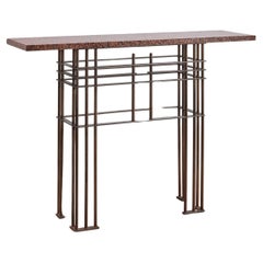 Dieses Objekt ist ein Schmuckstück, das in dieser seltenen Ausführung einen genieteten schmiedeeisernen Rahmen mit gehämmertem Zinkblech aufweist, der auf einer Holzplat...