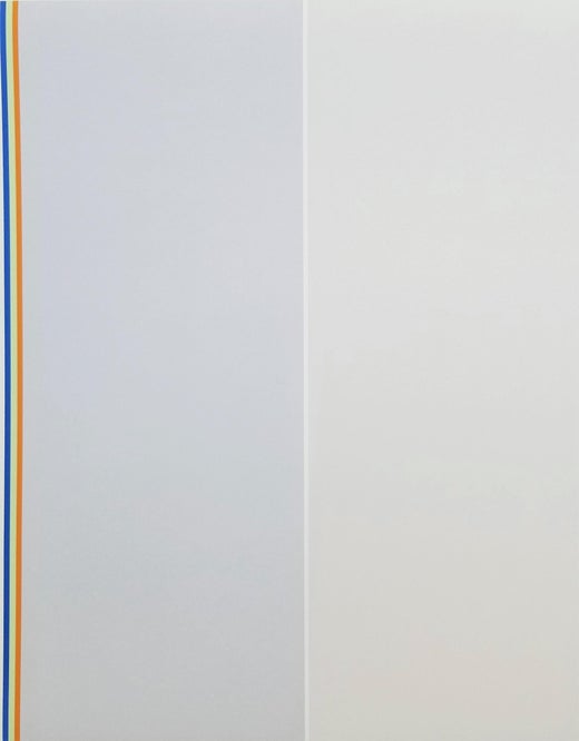 Vertikale Linien in gedeckten Farben nehmen die organische Qualität von handgeschöpftem Papier an und ergeben diese subtile Iteration von Gene Davis' ikonischen Farbfeld-Streifenbild...
