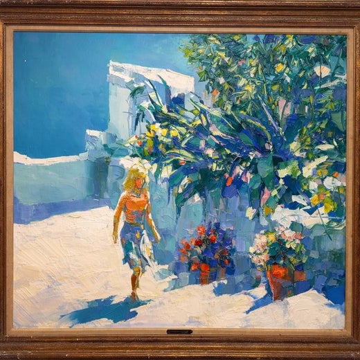 Der italienische Maler Nicola Simbari verwendete lebhafte Farben, um die Schönheit und den Reichtum des Lebens darzustellen. Seine figurativen Gemälde und Zeichnungen sind oft in heiteren mediterranen Landschaften angesiedelt, was ihnen eine romantische Qualität verleiht. Simbari hatte einen unverwechselbaren zeitgenössischen und expressionistischen Stil, der sich durch breite Pinselstriche in gesättigten Pastellfarben auszeichnete und Szenen schuf, die in Sonnenlicht getränkt zu sein schienen.