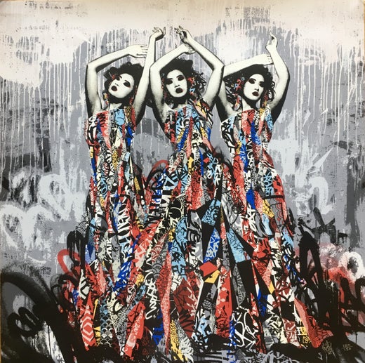 Diese Frauen sind in lebhafte Muster gekleidet, die einer alten japanischen Tradition neues Leben einhauchen. Bei genauer Betrachtung der Werke wird deutlich, dass Hush eine nahtlose Mischung aus Alt und Neu geschaffen hat. Traditionelle japanische Farben und Drucke werden direkt neben modernen Graffiti-Schriften verwendet, die geschickt als Stoff getarnt sind.