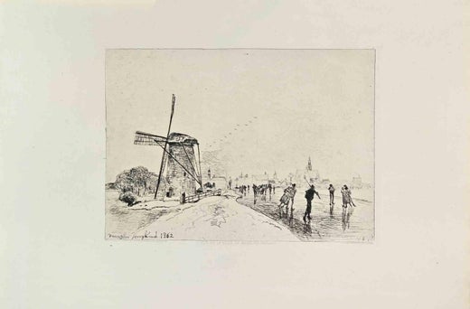 This etching stands among Jongkind’s most celebrated plates, uniting topographical accuracy with emotional immediacy. The viewer is drawn into the tranquil rhythm of Dutch life—windmill, ice, sky, and human figures harmonized within a landscape of quiet modern poetry.