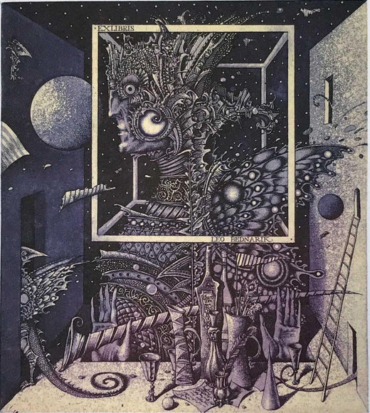 Ein Exlibris-Druck mit den Fantasiefiguren und Musikern in surrealem M.C. Gebäude im Escher-Stil. Roman Sustovs Grafiken bieten oft eine fantastische Mischung aus klassischer Technik...