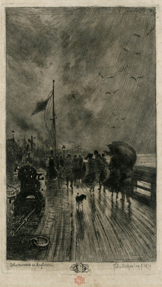 In seinen zahlreichen Druckgrafiken von Stadtansichten und Seelandschaften ging es Buhot darum, eine bestimmte Atmosphäre zu schaffen, insbesondere die Auswirkungen des Wetters, vor allem Regen, Schnee, Nebel und Dunst. Er ließ sich von seiner unmittelbaren Umgebung, dem Boulevard de Clichy in Montmartre, Paris, zu seinen Grafiken des städtischen Alltagslebens inspirieren. Buhot liebte es, das abwechslungsreiche Straßenleben der pulsierenden Hauptstadt nicht nur in den verschiedenen Jahreszeiten (Winter in Paris, 1879), sondern auch in Momenten der öffentlichen Zurschaustellung zu porträtieren, von einer festlichen Feier (Nationalfeiertag auf dem Boulevard de Clichy, 1878) bis hin zu einer düsteren Totenfeier (Leichenzug auf dem Boulevard de Clichy, 1887). Zu seinen Stadtansichten gehören auch Londoner Szenen (Westminster Palace und Westminster Bridge, beide von 1884). Und Buhots Liebe zum Meer zeigt sich in den vielen Drucken, die die sich ständig verändernden atmosphärischen Bedingungen und Stimmungen erkunden. Buhots Schiffsreisen nach England inspirierten ihn zu zwei seiner charakteristischsten Grafiken, A Pier in England und Landing in England, beide aus dem Jahr 1879.