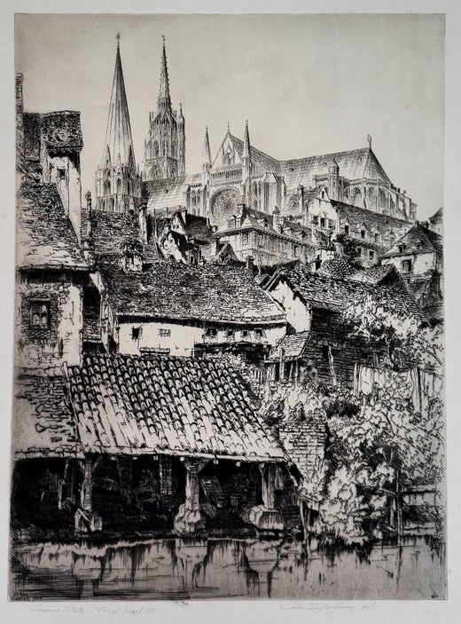 John Taylor Arms wurde 1887 in Washington, D.C., geboren. Arms studierte Architektur in Princeton und am MIT und wurde später zum besten Radierer seiner Zeit im Land. Seine Darstellungen europäischer und amerikanischer architektonischer Themen sind nicht nur schön, sondern auch unübertroffen in ihrer technischen Virtuosität und ihrem nuancierten Licht. Wie das Cleveland Museum kürzlich in einer Ausstellung feststellte, glaubte Arms, dass die Kunst ein Werkzeug für die geistige und moralische Verbesserung der Menschheit sein könne und dass die gotischen Kathedralen der bedeutendste Ausdruck der menschlichen Bestrebungen seien. Er betrachtete die Druckgrafik als ein Mittel, um Bilder von Themen zu verbreiten, die die zeitgenössische Gesellschaft erheben und inspirieren sollten. Er war Präsident der Society of American Etchers und Botschafter für amerikanische Grafiker und die Druckgrafik in der ganzen Welt.