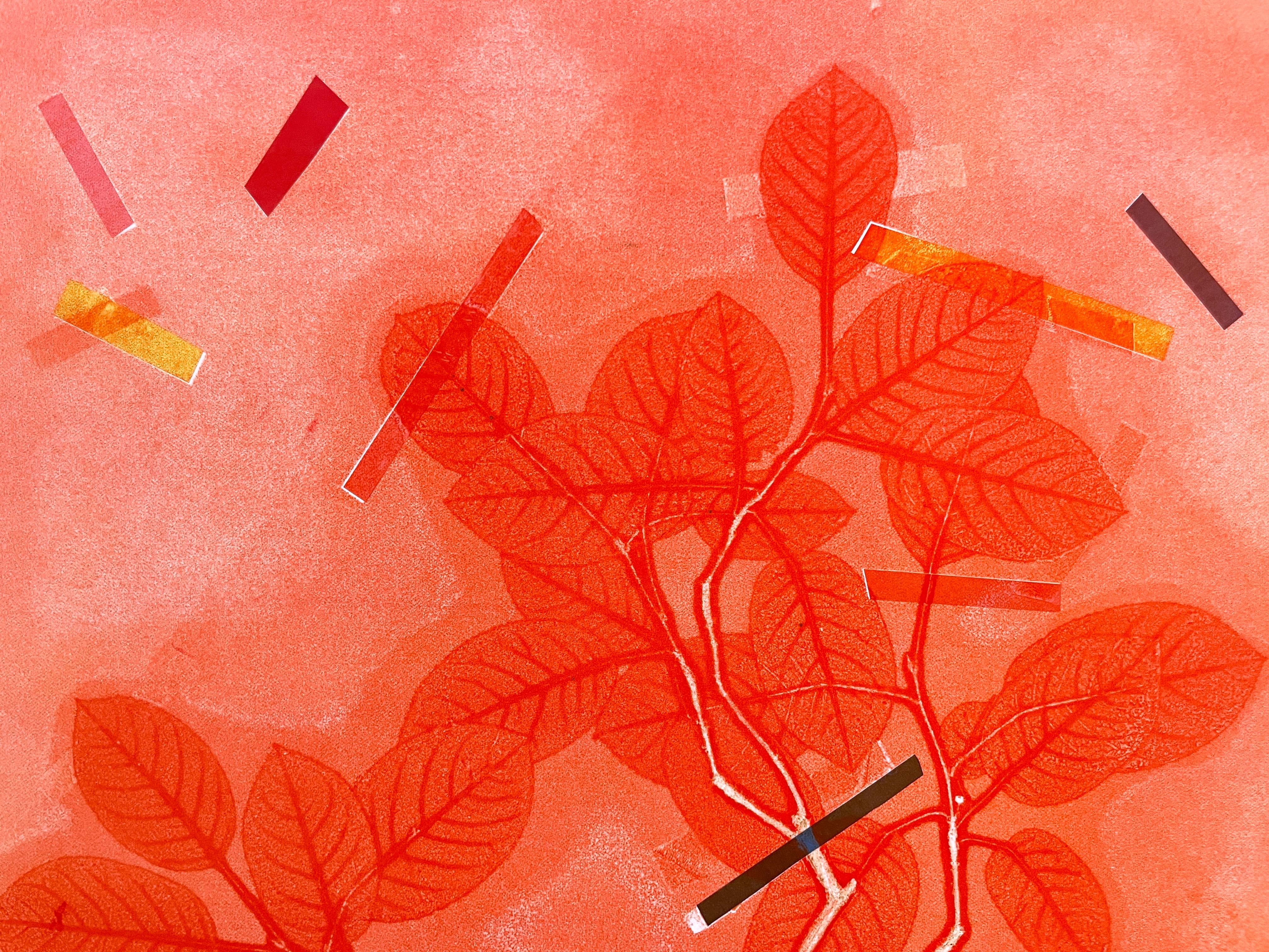 "Smoke Bush Orange" von Deirdre Murphy ist ein gerahmter, einzigartiger Monodruck mit Collage (Chine Collé - aufgebrachtes japanisches farbiges Gampi-Papier) in einer Reihe von Manda...