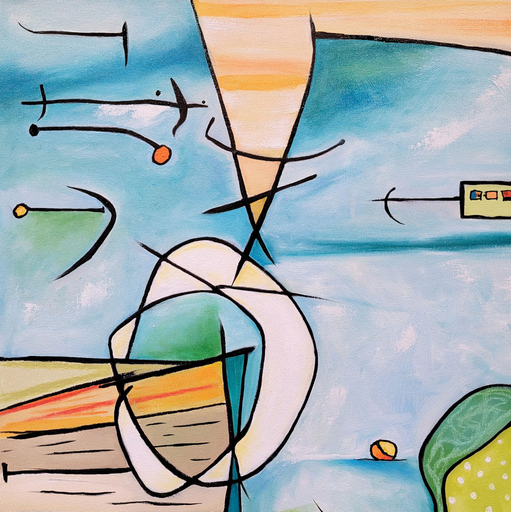"A Tree Grows by the shore" ist ein 30 x 30 x 1,5 Zoll großes Ölgemälde auf Leinwand von Anita Loomis, das eine lebendige und fantasievolle Landschaft zeigt, die einen Moment in der Nähe des Ufers an einem sonnigen, windigen Tag einfängt. Diese abstrakte Komposition zeigt Anitas ausdrucksstarke Linienführung, frische, saubere Sommertöne in Blau, Grün und Orange sowie eine verspielte Darstellung von Gras, Booten, Bäumen und Docks. Der Malstil, der auf ihre Vergangenheit als Glasmalerin und ihre Vorliebe für die europäische expressionistische Malerei hinweist, ist charakteristisch für Loomis' Werk. Dieses Gemälde ist auf der Rückseite und am linken Galerierand signiert.