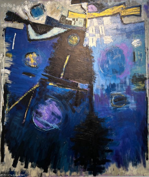 Achilles at the Gates of Hell ist ein zeitgenössisches abstraktes Ölgemälde von David Richardson, Teil seiner Serie Trojanischer Krieg, inspiriert von der Ilias. Achilles war ein gri...