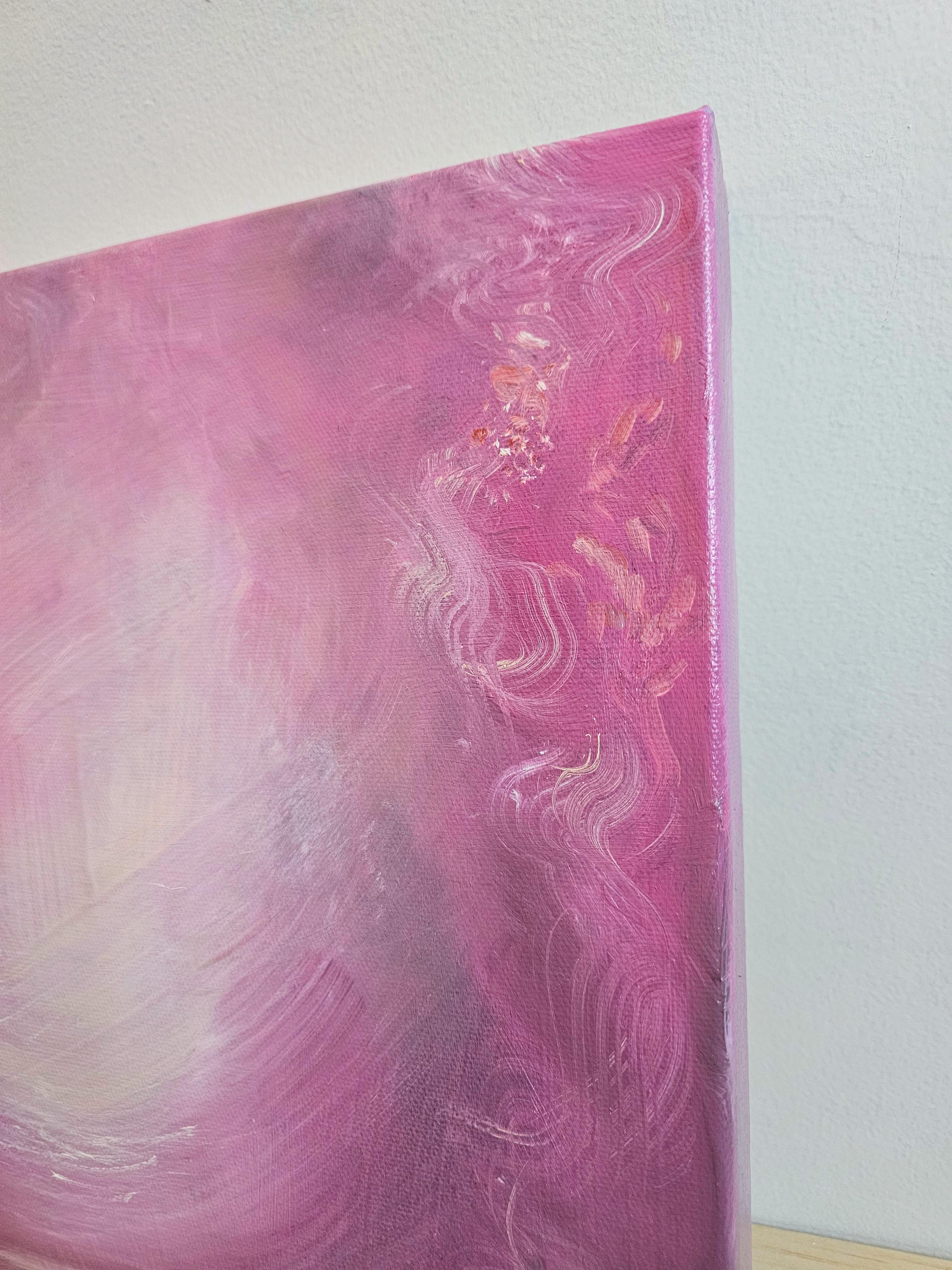 Sanftes, ätherisches abstraktes Gemälde in zarten rosa Tönen. "Die Romantik der Farbe Rosa - das Flüstern einer Röte, Rosenblätter, die auf dem Tisch...