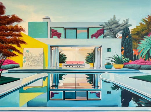 Lilly Muths Gemälde laden uns ein, in eine andere Welt einzutauchen - eine Welt, in der Architektur, Pools, Geometrie, Natur und ein Kaleidoskop von Farben zusammenkommen, um eine fesselnde Traumlandschaft zu schaffen, die über das Gewöhnliche hinausgeht und uns einlädt, die grenzenlosen Bereiche der künstlerischen Fantasie zu erkunden.