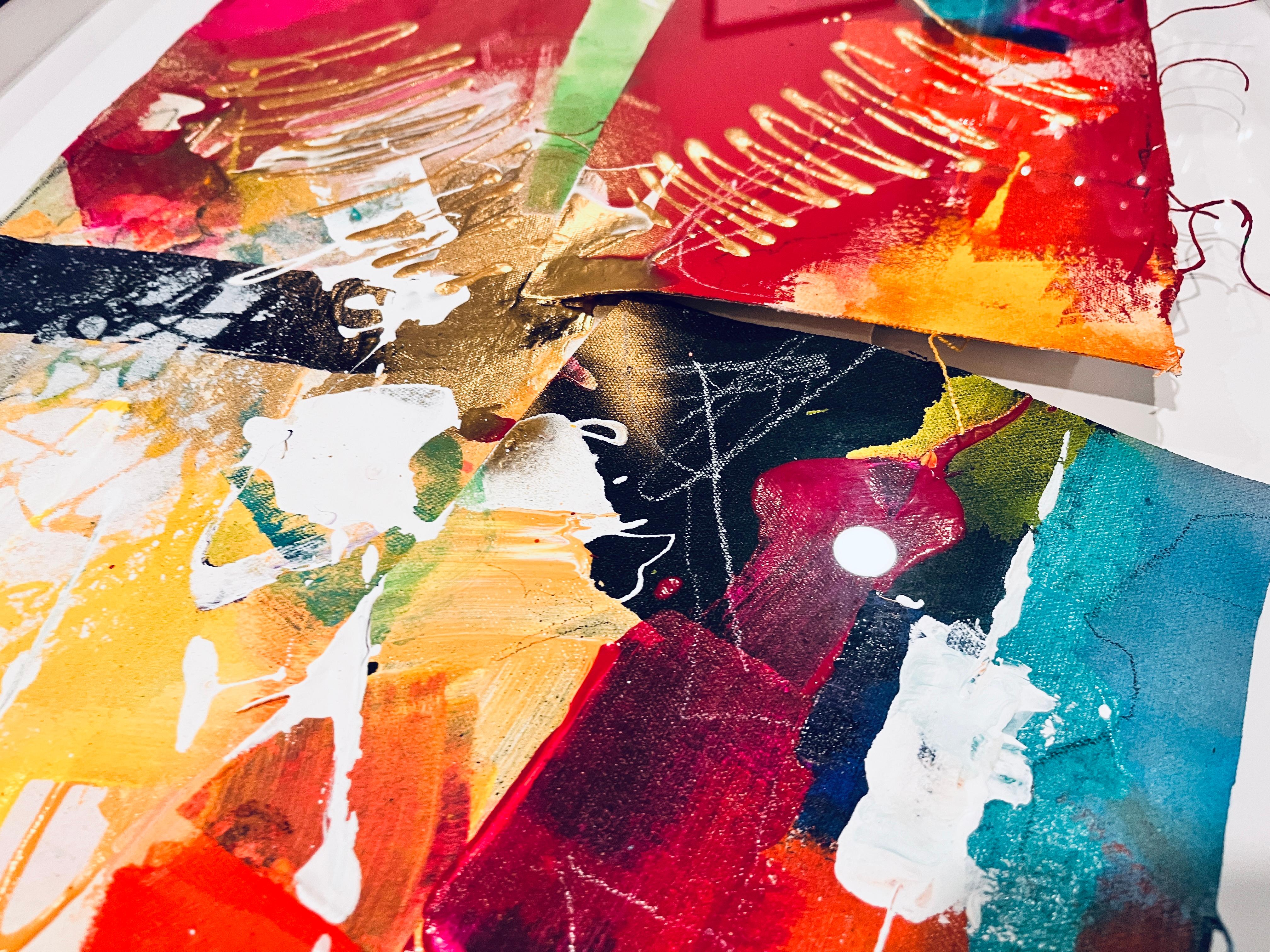 "Rhythmic Chaos" ist ein kühnes und dimensionales abstraktes Kunstwerk, das vor Energie, Farbe und Instinkt pulsiert. Jedes der auf roher Leinwand gemalten Fragmente wurde absichtlich zerrissen, strukturiert und dann auf einzelne Tafeln montiert, um eine skulpturale, vielschichtige Komposition zu bilden. Diese Elemente schweben in einem tiefen Schattenbox-Rahmen, so dass Licht und Schatten mit den hochgezogenen Kanten, den ausgefransten Fäden und den erhabenen Goldmarkierungen interagieren können, was dem gesamten Werk ein Gefühl von Bewegung in der Zeit verleiht.