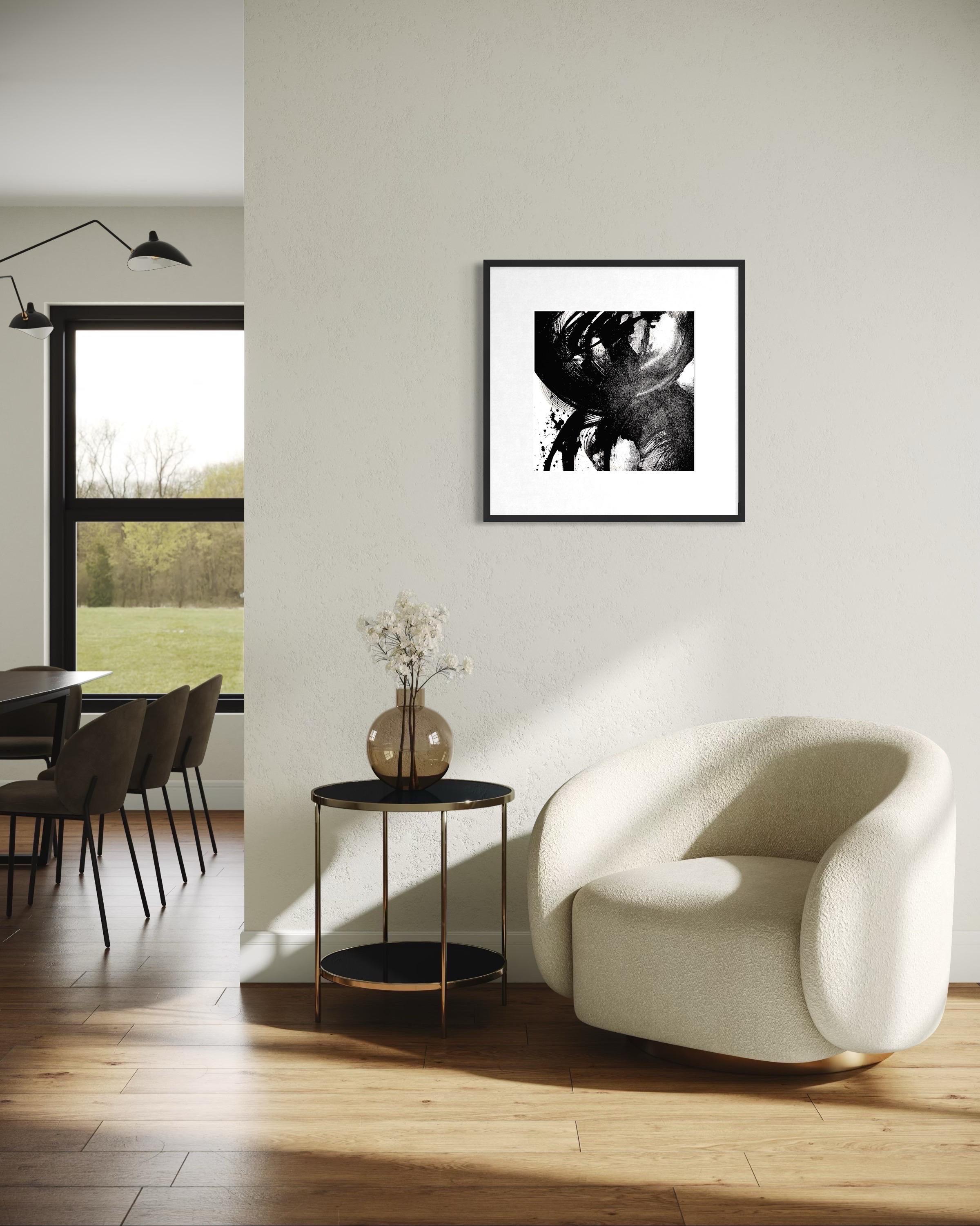 Um die grafische Kraft des Bildes zu ergänzen, wird jeder Druck mit einem Passepartout und einem Trägerkarton in Museumsqualität präsentiert, die präzise zugeschnitten sind, um das visuelle Gleichgewicht zu wahren und die zeitgenössische Präsenz des Kunstwerks zu verstärken. Das Passepartout bietet auf allen Seiten einen fünf Zentimeter breiten weißen Bereich, der eine raffinierte Grenze zwischen Kunstwerk und Rahmen bildet. Das Bild misst 12 × 12 Zoll, mit einer Gesamtgröße von 18 × 18 Zoll, die so gestaltet ist, dass es in einen Standardrahmen passt und gleichzeitig den großzügigen Sinn für Größe und Atem des Werks bewahrt.