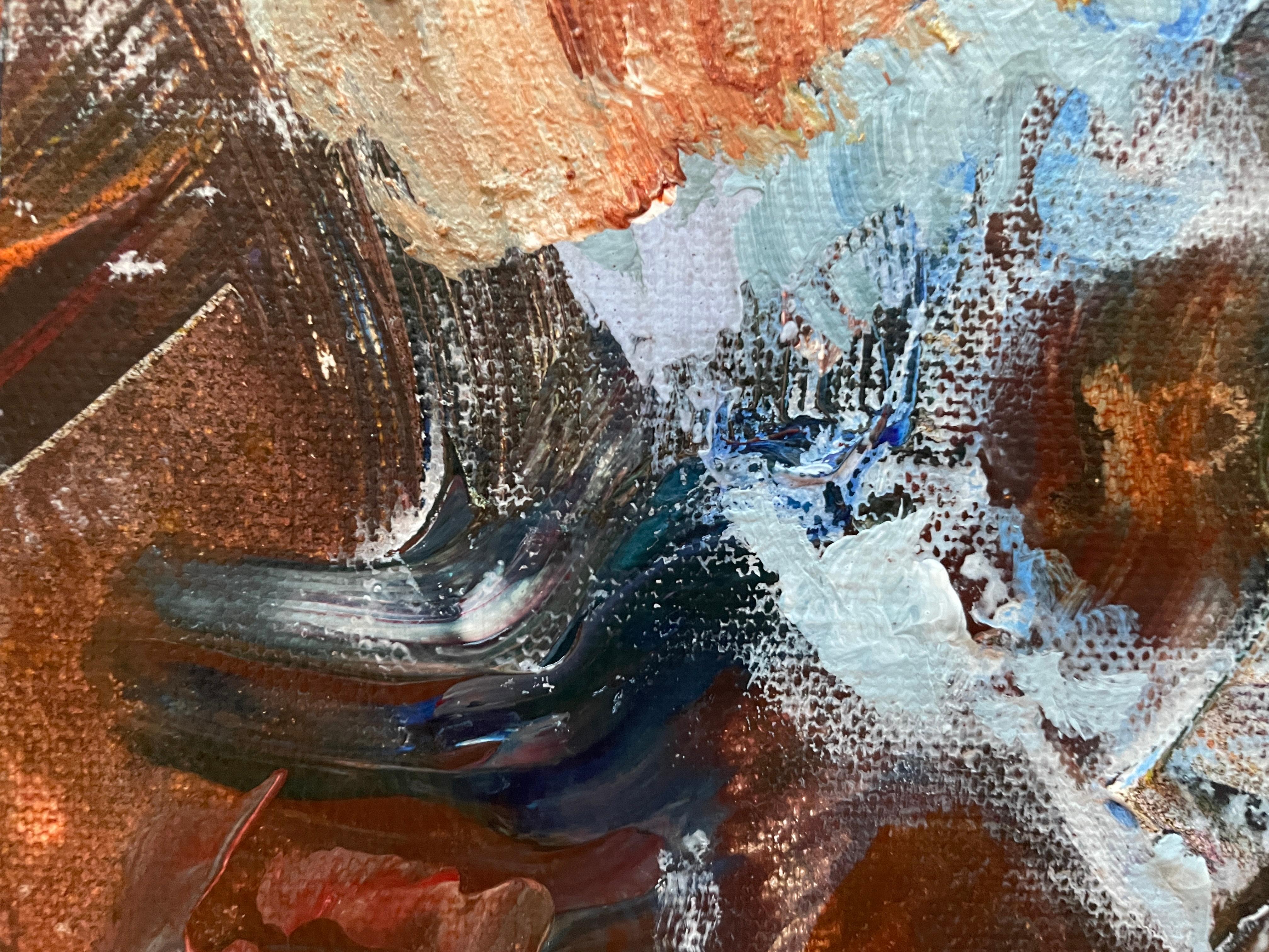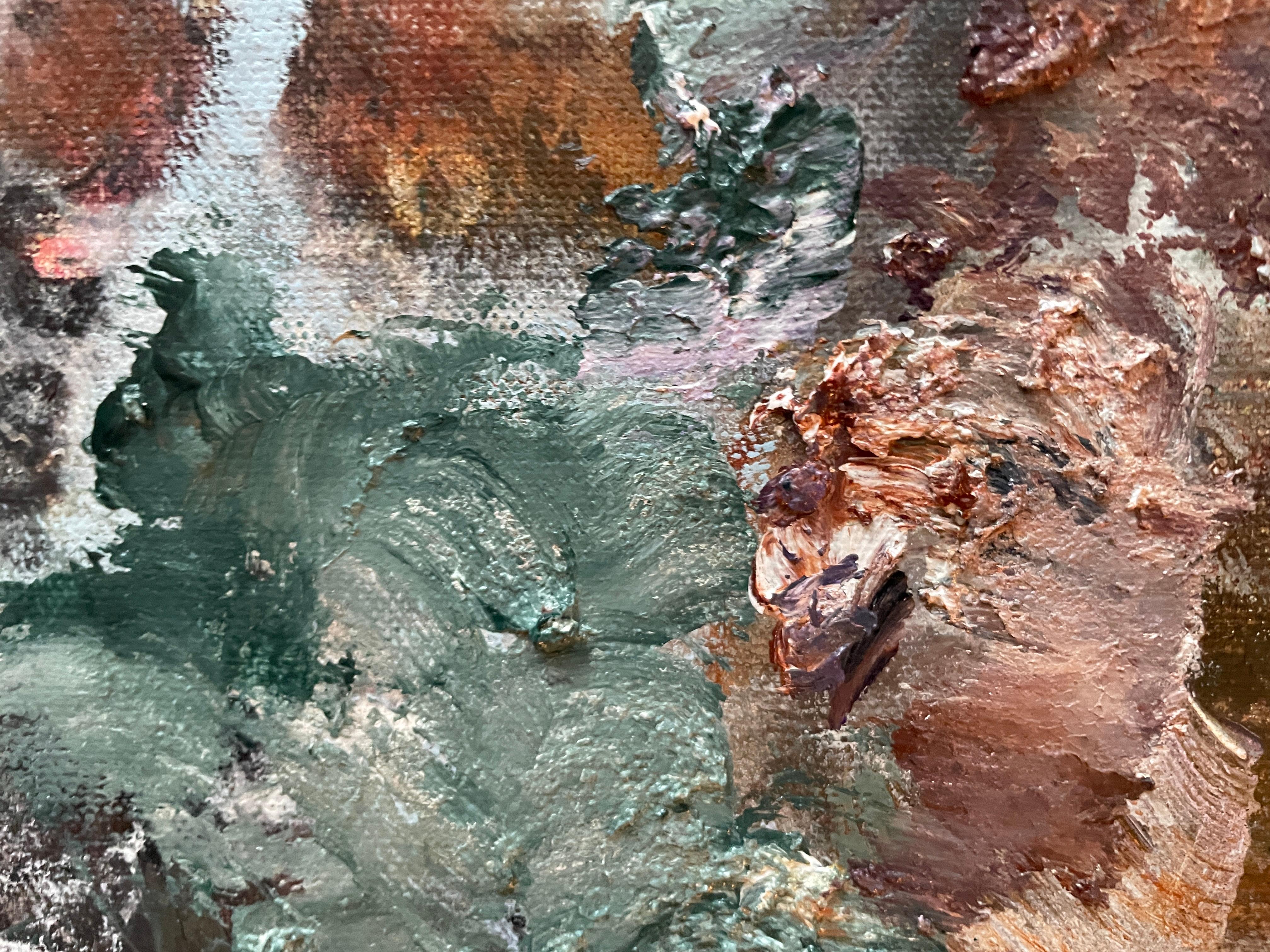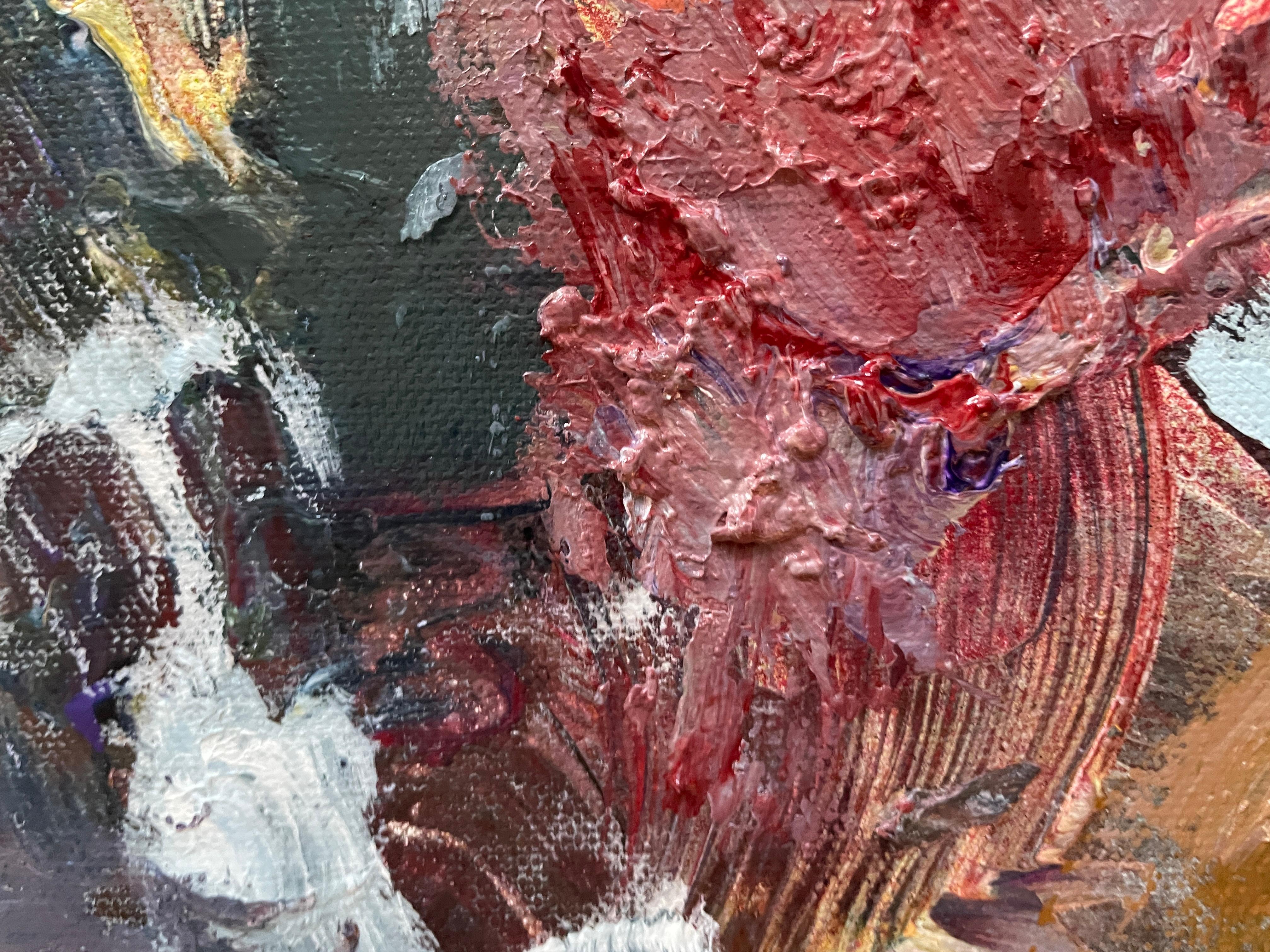 Dieses Kunstwerk ist ein stimmungsvoller abstrakter Ausdruck eines Blumenstraußes, in dem lebendige Farben zu einer hypnotisierenden Komposition verschmelzen. Satte Rottöne, erdige Brauntöne und zarte Rosatöne dominieren und vermischen sich mit gesprenkeltem Weiß und subtilem Grün, wodurch eine dynamische und strukturierte Oberfläche entsteht. Der Künstler wendet eine dicke Impasto-Technik an, die der Leinwand Tiefe und taktile Qualität verleiht. Die Anordnung der Farben und Formen scheint die flüchtige Schönheit von Blumen in voller Blüte einzufangen, während der Hintergrund zurückhaltend bleibt und die Komplexität des Vordergrunds zur Geltung kommt. Das Werk lädt den Betrachter dazu ein, die Schichten und Pinselstriche zu erforschen und bietet eine visuelle Erfahrung. Der abstrakte Stil stellt traditionelle Darstellungen in Frage und betont die emotionale Resonanz gegenüber der buchstäblichen Interpretation, was ihn zu einer herausragenden Ergänzung der zeitgenössischen Kunst macht.
