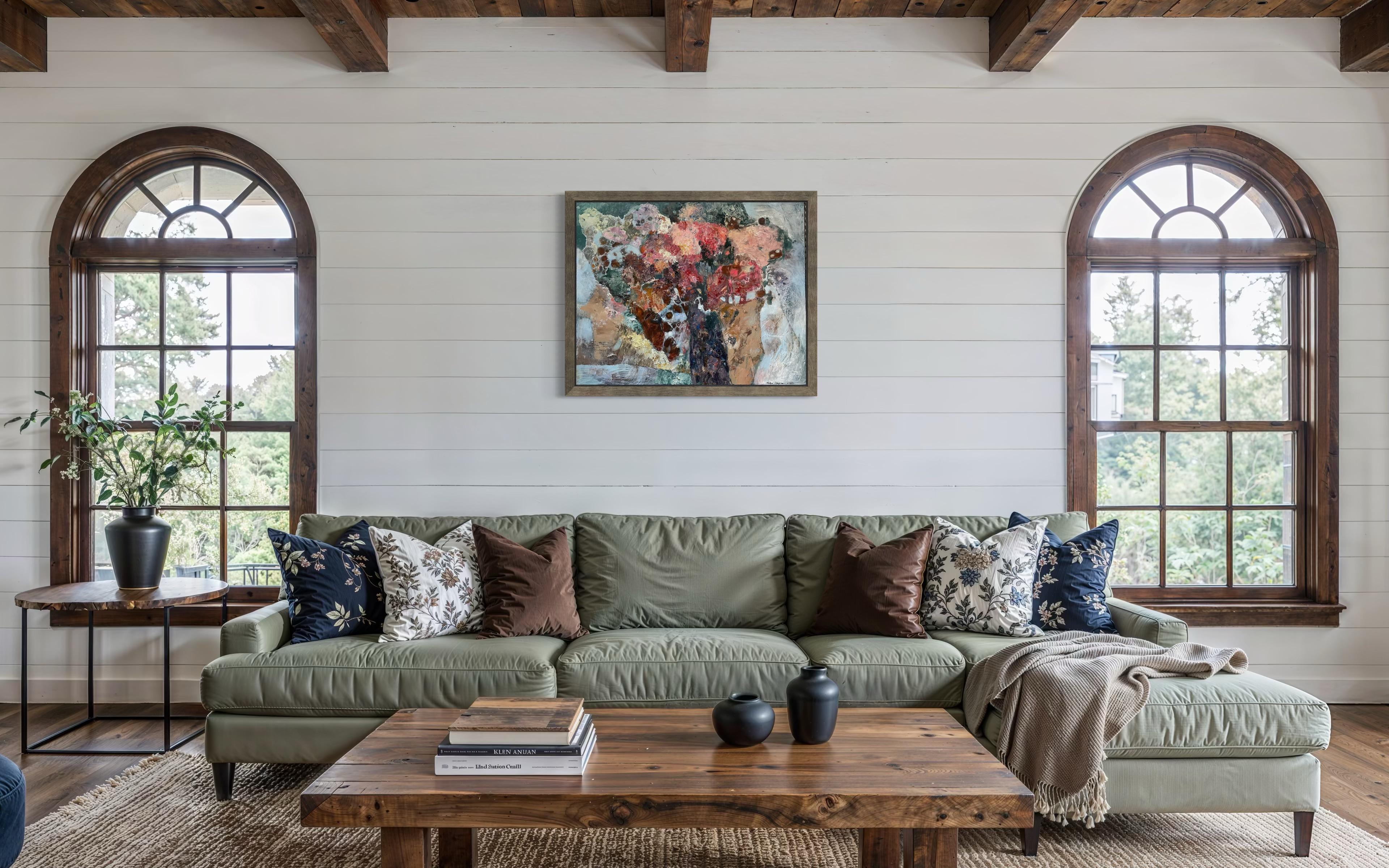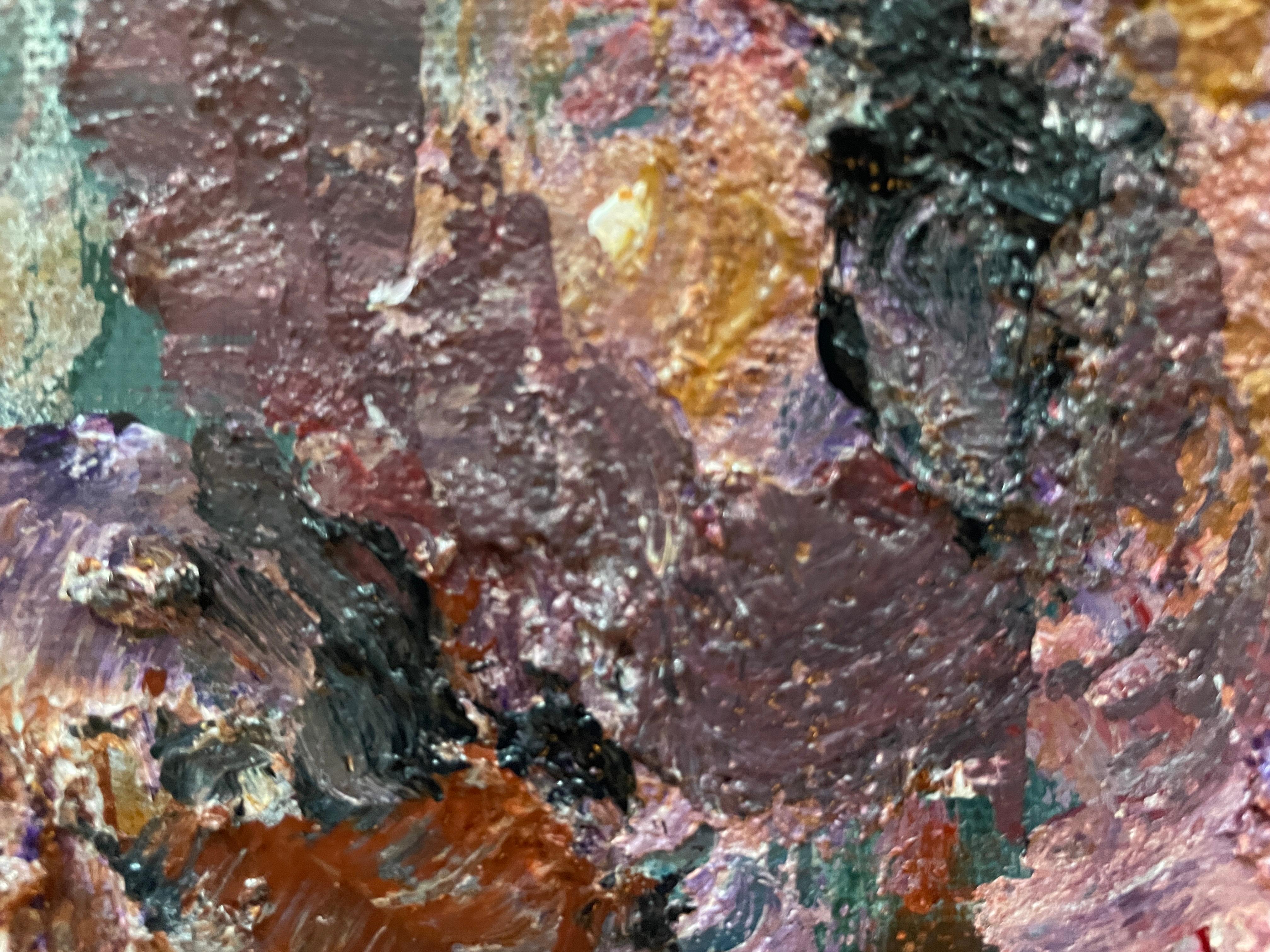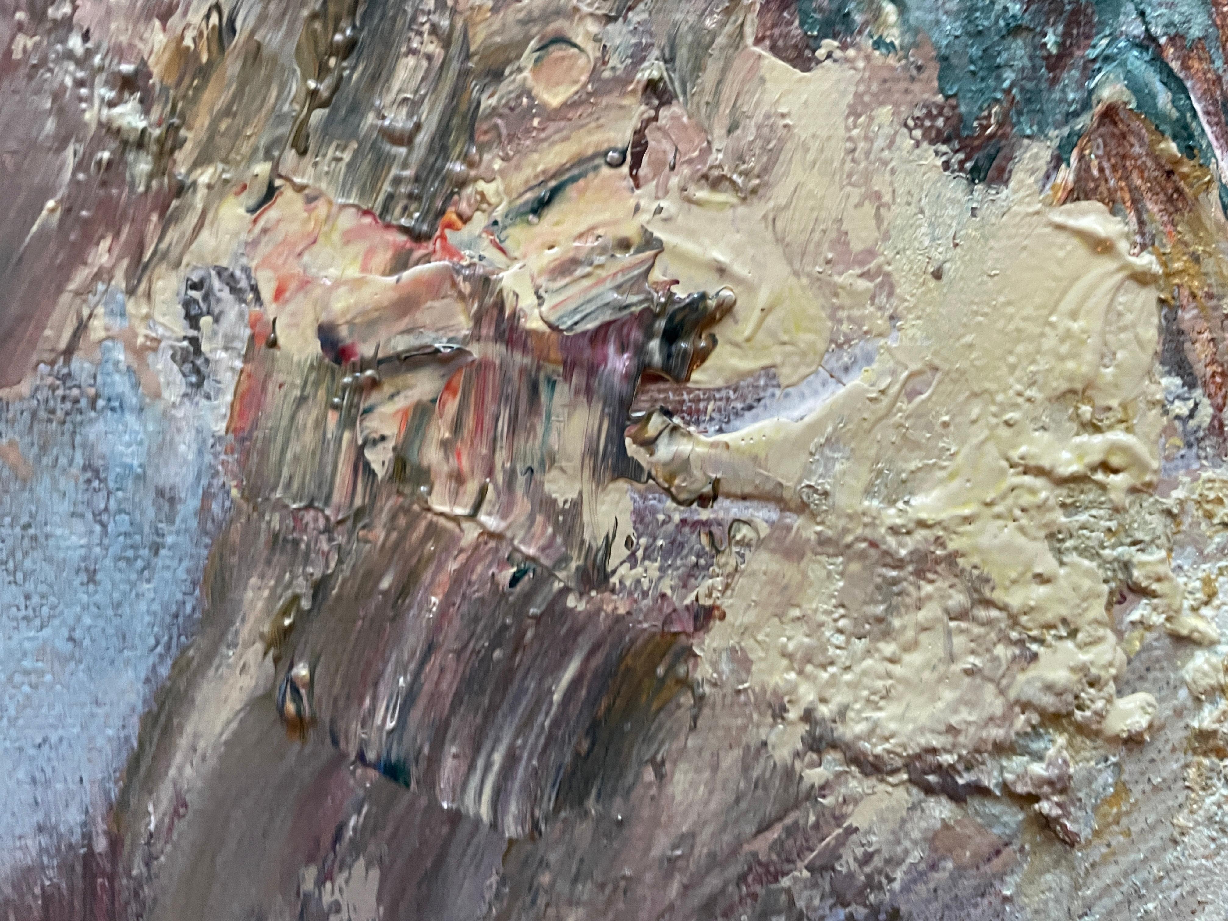 Dieses Kunstwerk ist ein stimmungsvoller abstrakter Ausdruck eines Blumenstraußes, in dem lebendige Farben zu einer hypnotisierenden Komposition verschmelzen. Satte Rottöne, erdige Brauntöne und zarte Rosatöne dominieren und vermischen sich mit gesprenkeltem Weiß und subtilem Grün, wodurch eine dynamische und strukturierte Oberfläche entsteht. Der Künstler wendet eine dicke Impasto-Technik an, die der Leinwand Tiefe und taktile Qualität verleiht. Die Anordnung der Farben und Formen scheint die flüchtige Schönheit von Blumen in voller Blüte einzufangen, während der Hintergrund zurückhaltend bleibt und die Komplexität des Vordergrunds zur Geltung kommt. Das Werk lädt den Betrachter dazu ein, die Schichten und Pinselstriche zu erforschen und bietet eine visuelle Erfahrung. Der abstrakte Stil stellt traditionelle Darstellungen in Frage und betont die emotionale Resonanz gegenüber der buchstäblichen Interpretation, was ihn zu einer herausragenden Ergänzung der zeitgenössischen Kunst macht.