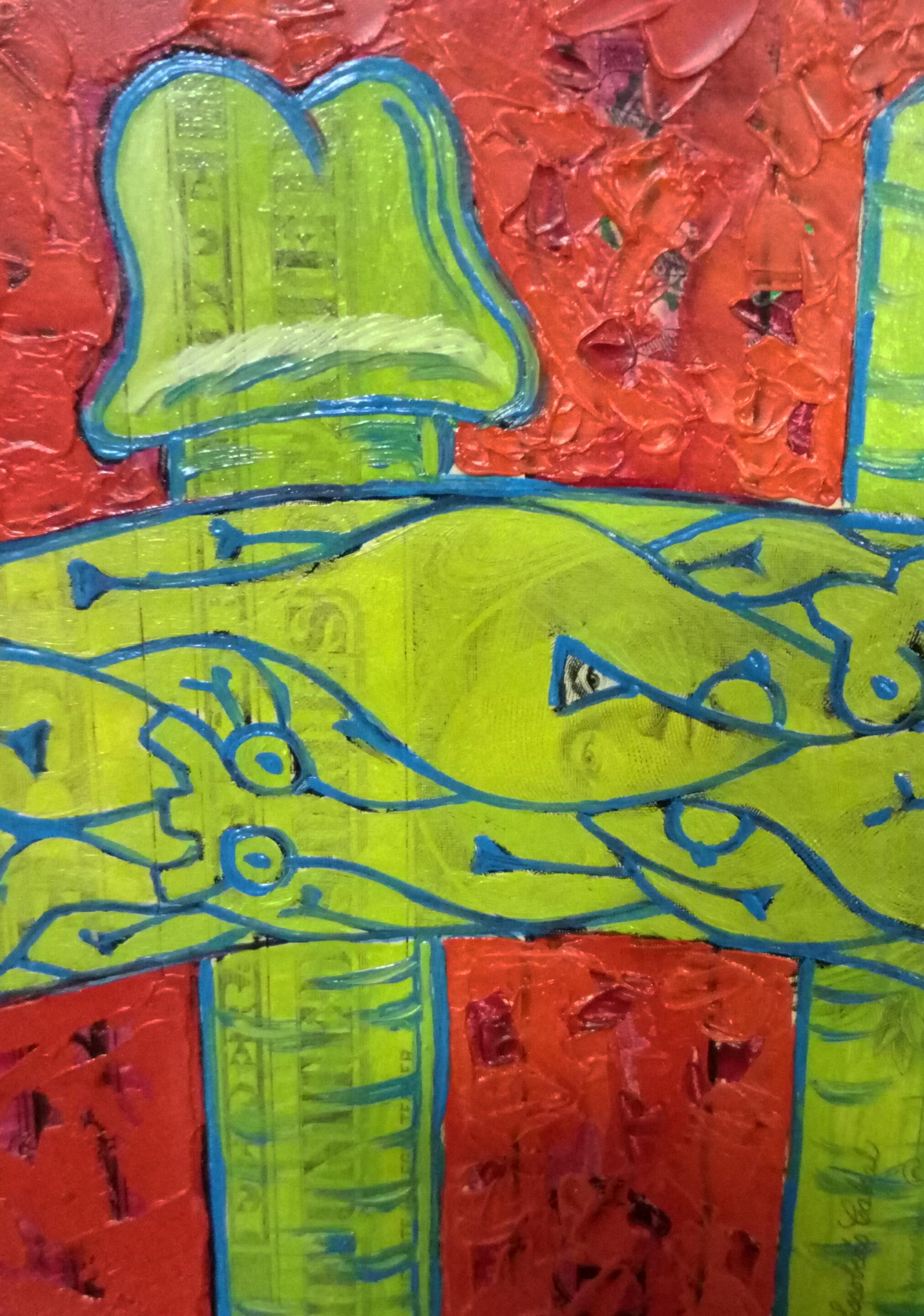 In diesem Gemälde habe ich eine traditionelle Landschaft in eine schwebende, schlangenartige Form verwandelt und das Realistische mit dem Surrealen vermischt. Jedes der akribisch in ...