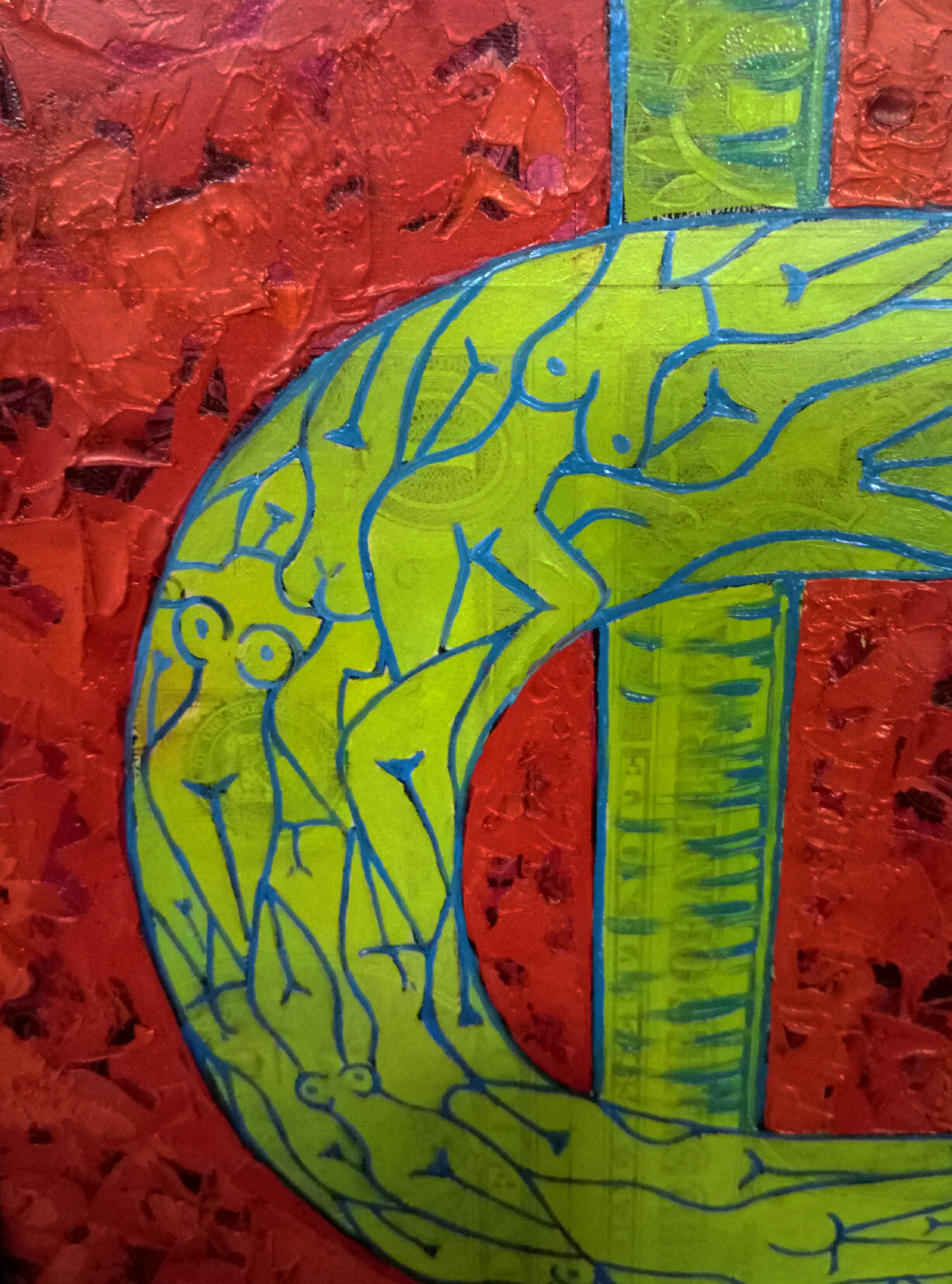 Bei der Ausarbeitung dieses Werks habe ich mich mit der Symbiose von Surrealismus und Symbolismus beschäftigt, um eine lebendige Auseinandersetzung mit wirtschaftlichen Themen darzustellen. Das leuchtend grüne Dollarzeichen, verschlungen und fast lebendig, verkörpert die berauschende Verlockung und den oft giftigen Griff des Geldes. Der feuerrote Hintergrund dient als starker, emotionaler Kontrast, der die Turbulenzen und die Inbrunst andeutet, die mit unserem Streben nach Reichtum verbunden sind. Dieses Gemälde ist ein leidenschaftlicher Dialog über die Macht und die Gefahren des wirtschaftlichen Begehrens, der in jedem Raum eine tiefgreifende Reflexion und dynamische Energie auslösen wird.