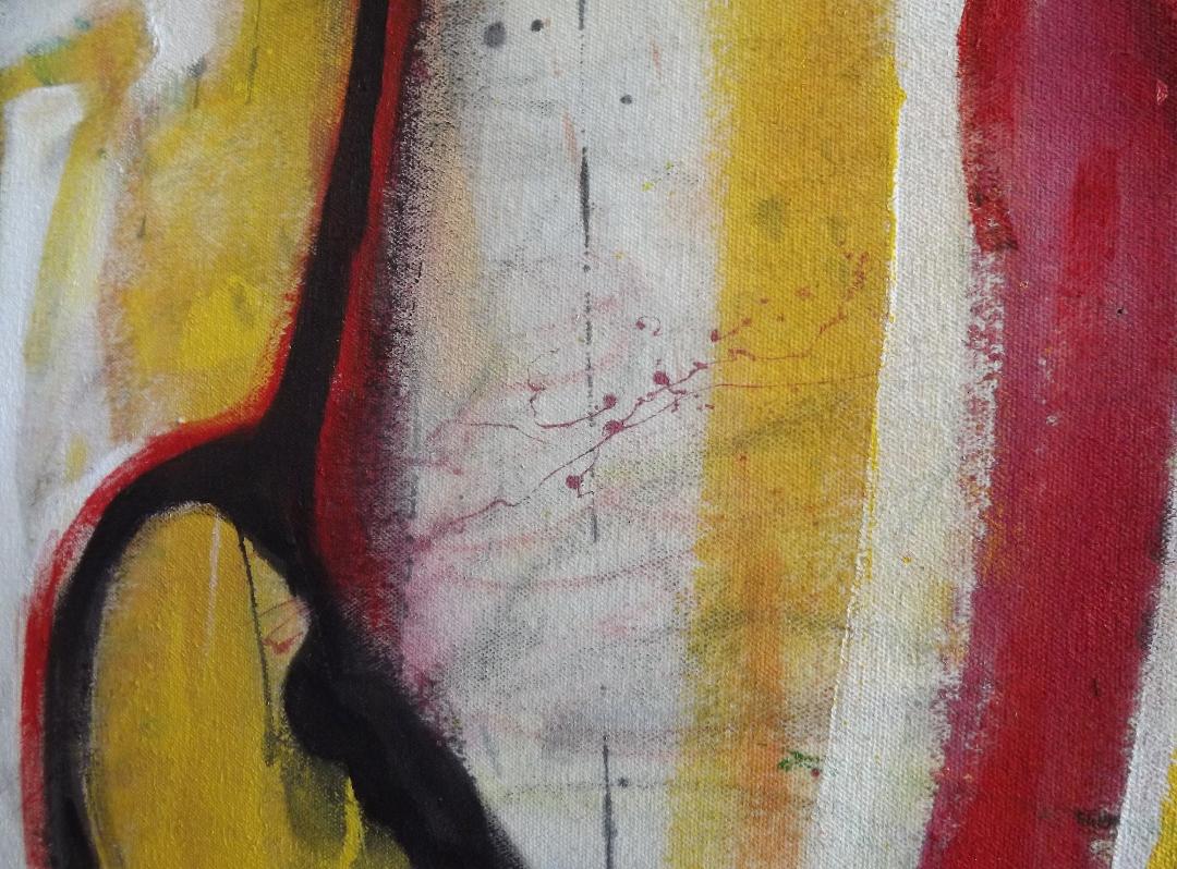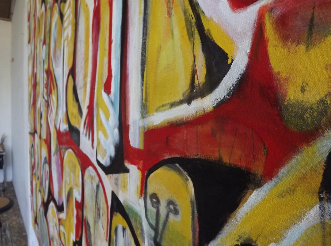„Studio Canal“, Stadt, Fabrik, Textur, Orange, Rot, Blau, Ölgemälde