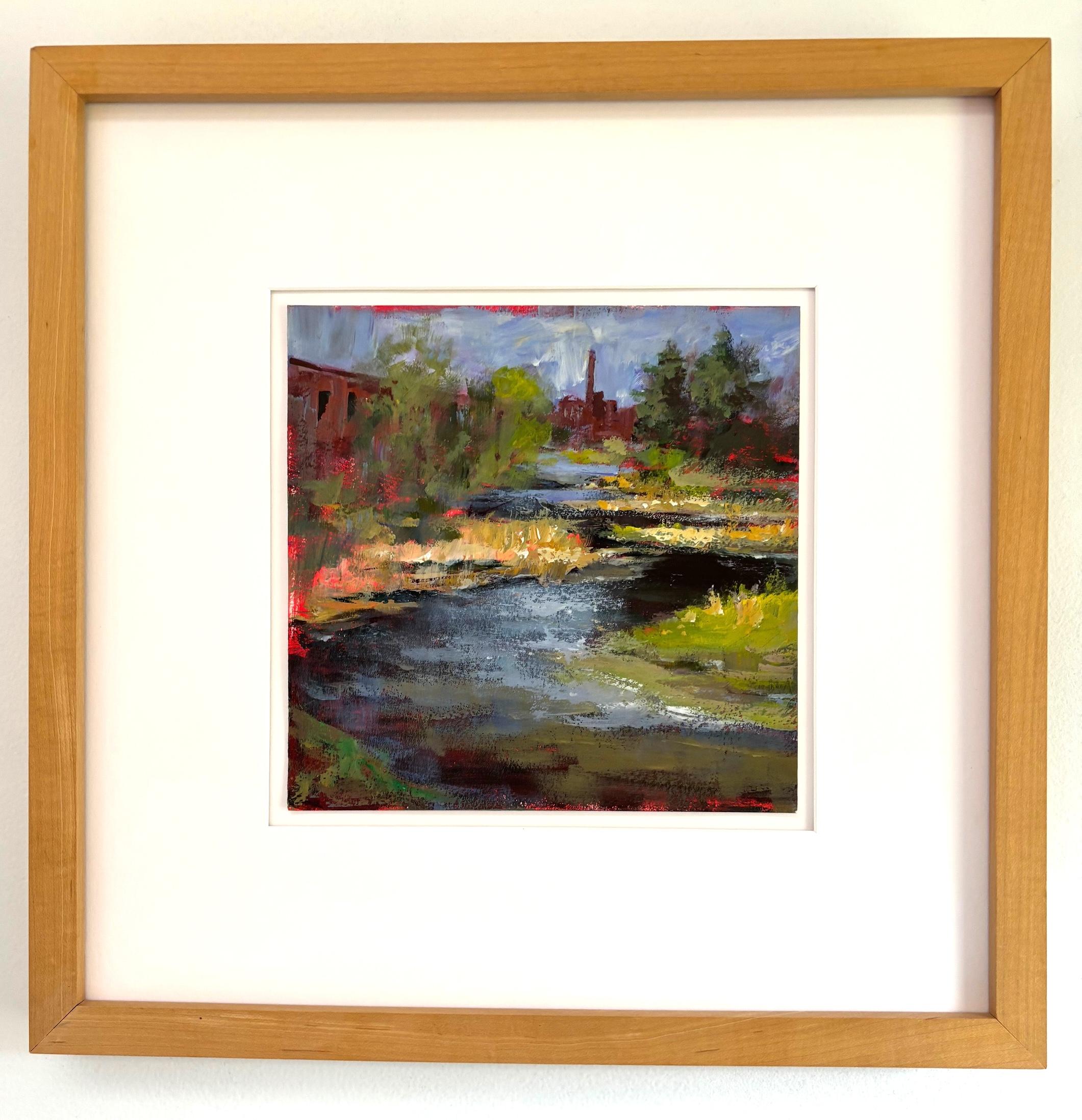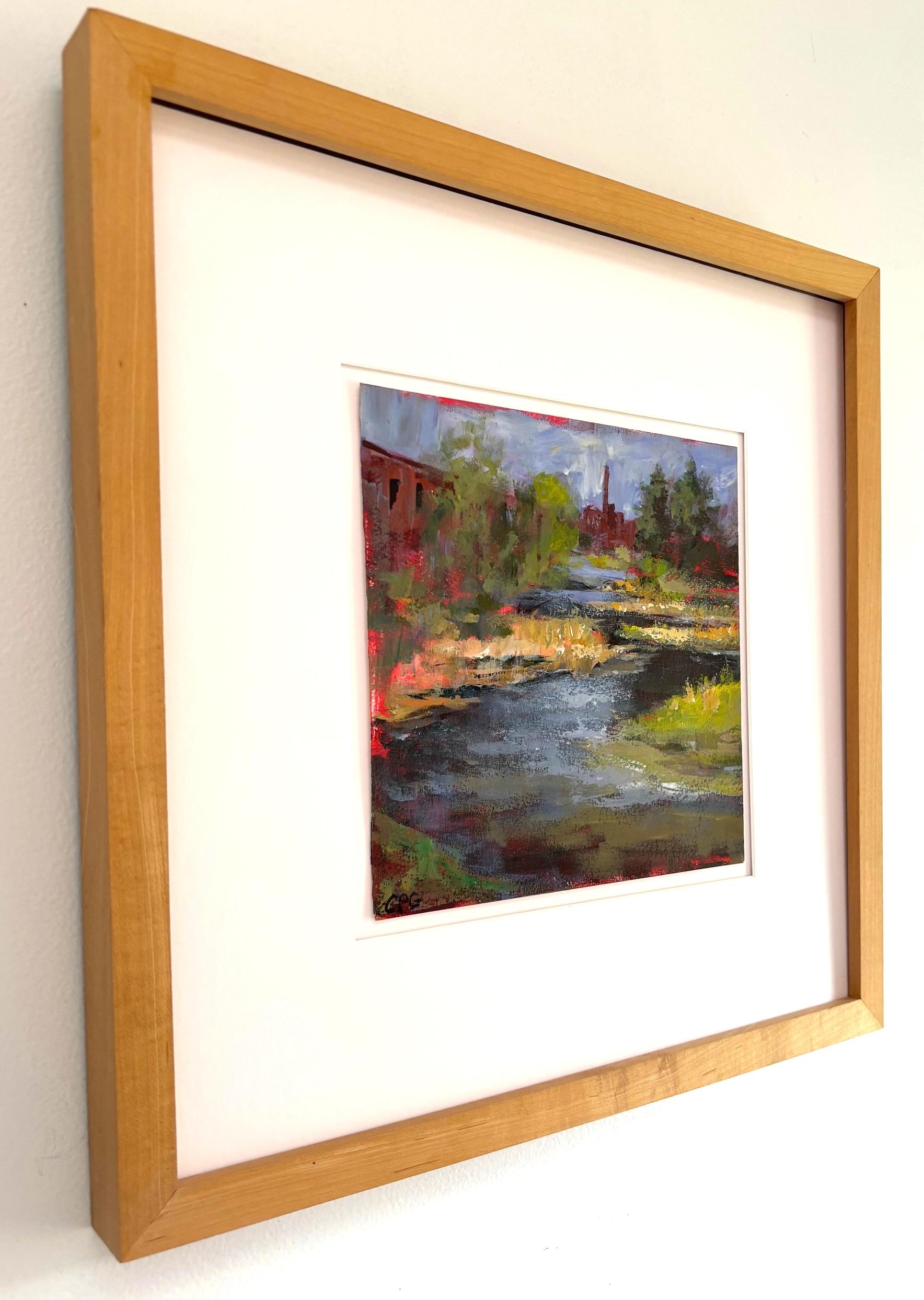 "Echoes of Riverside Mills" von Catherine Picard-Gibbs ist ein stimmungsvolles 8 x 8 Zoll großes Acrylbild auf Papier. Eine Palette aus Ziegelrot, Blau und Grün weckt in dieser stimmungsvollen Darstellung eines verlassenen Mühlengebäudes ein Gefühl von Nostalgie - und fängt die stille Poesie einer einstigen Industrielandschaft ein. Das Gemälde ist in ein doppeltes säurefreies weißes Passepartout eingefasst und wird in einem einfachen Ahornrahmen unter Plexiglas mit den Maßen 15,75 x 15,75 x 1,75 cm präsentiert. Verdrahtet und bereit zum Aufhängen.