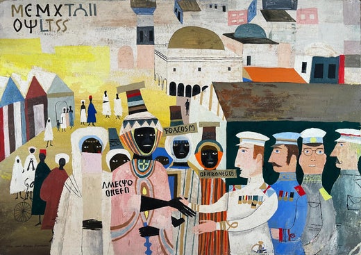 This deceptively naive painting was most likely done for a children's book. Upon close study, the viewer will recognize that this painting is anything but a child's effort. It's a greeting of Africa and Europe with Ge'ez or Ethiopic script used as call-outs to express in words and in pictures the narrative. It's quite a complex composition and flat pictorial style that predates many of similar works that are quite popular today The Provensens are the beloved couple that has done over 40 children's books. Signiert unten links. Hinged mounted on archival board but unframed. Gouache on board.