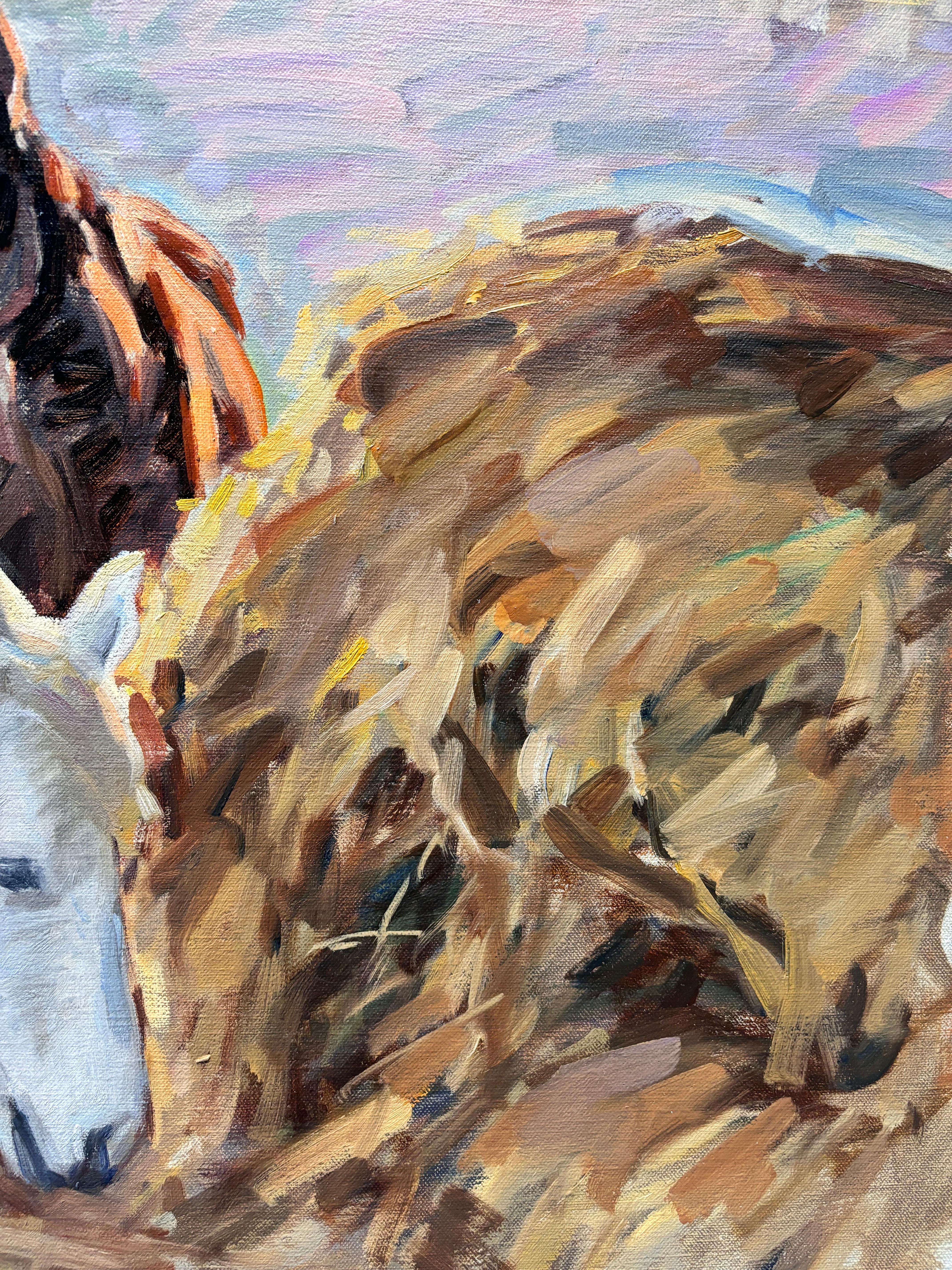 "Pony und Bräutigam" ist ein ungerahmtes, zeitgenössisches impressionistisches Gemälde in Öl auf Holzplatte. Gemalt während des Wellington Winter Equestrian Festival 2014. In der Mit...