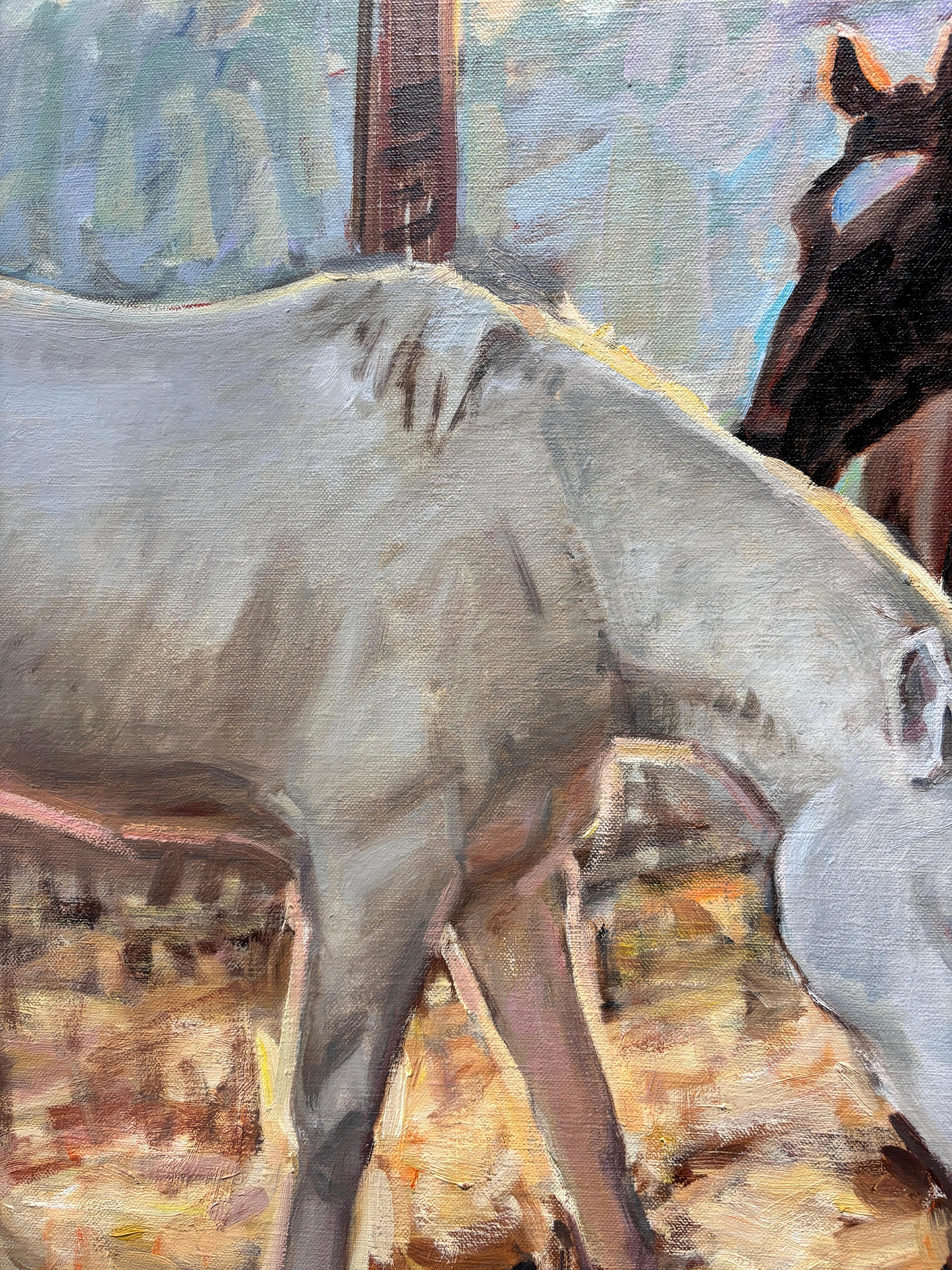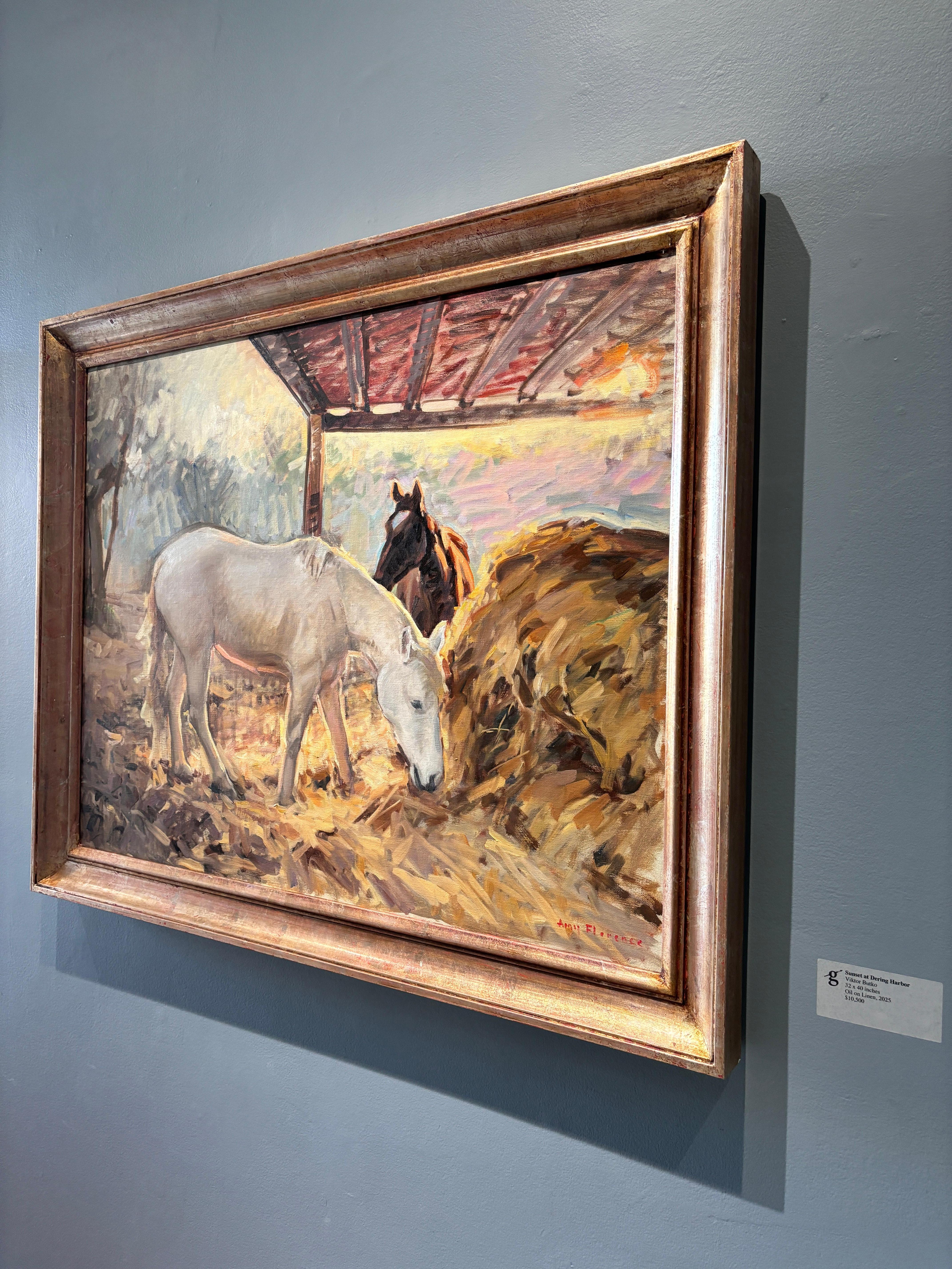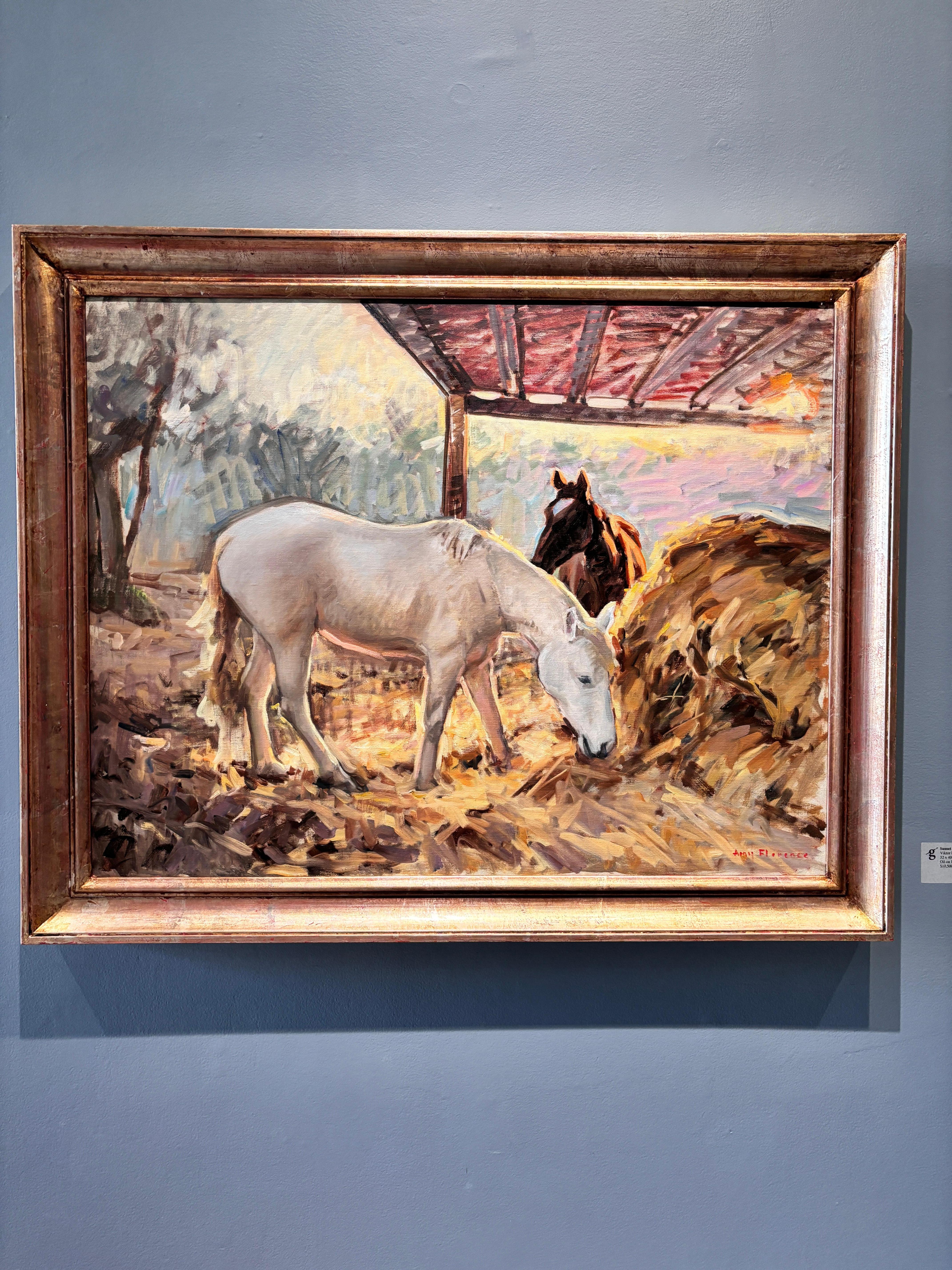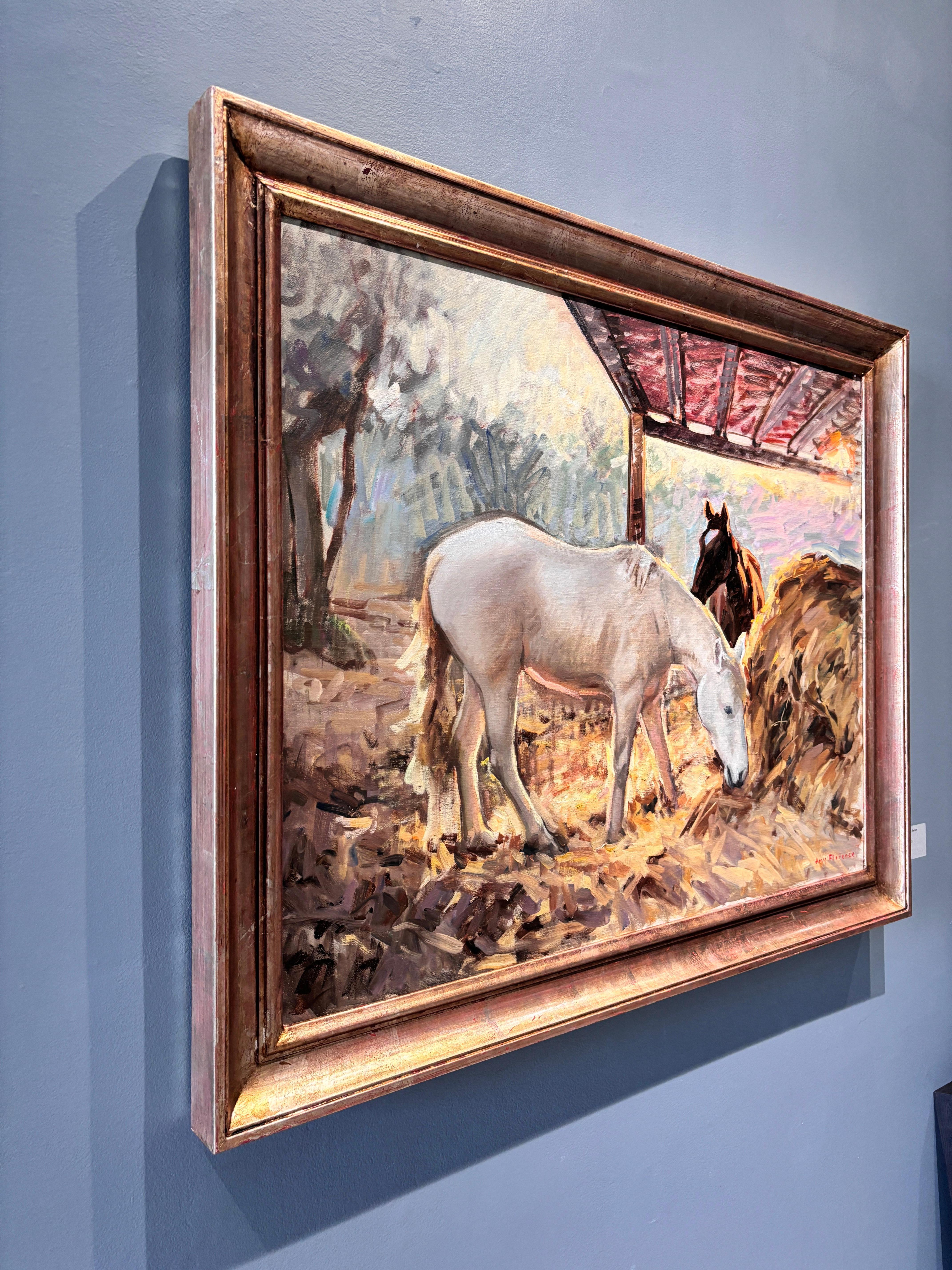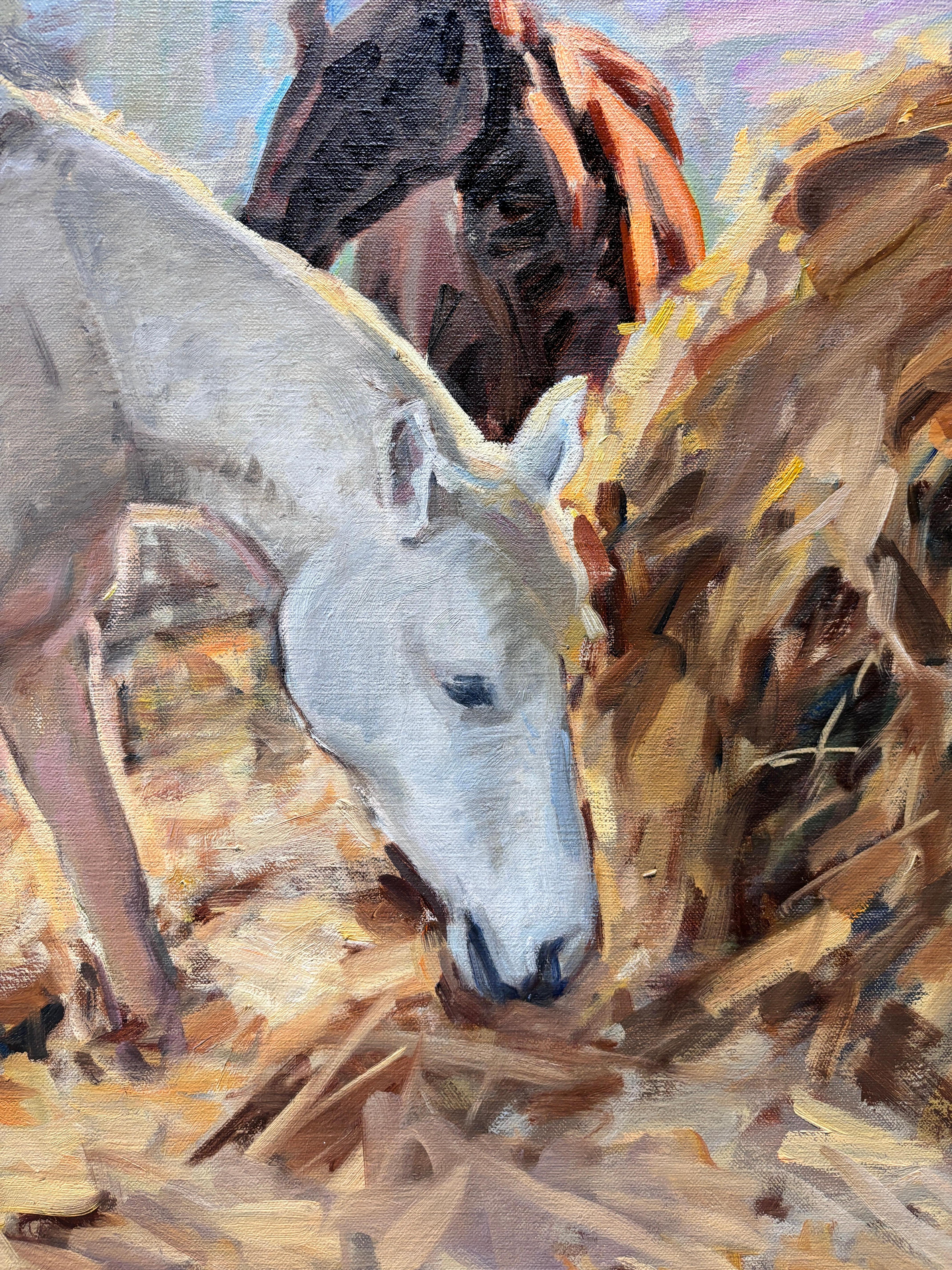 Ein Ölgemälde von Amy Florence (geb. 1989, England), das zwei Pferde zeigt, die in einem stallähnlichen Gebäude auf Heu grasen.