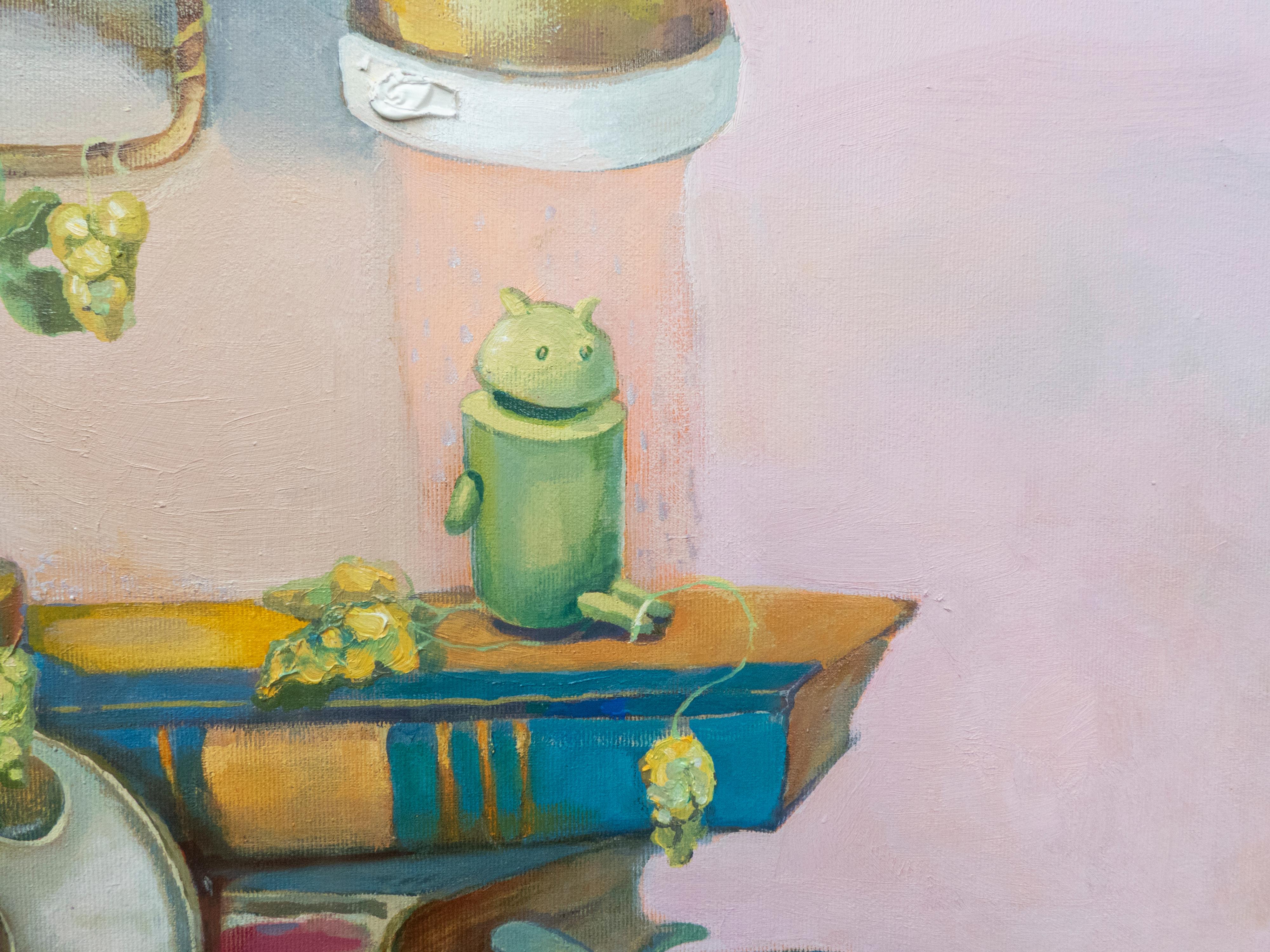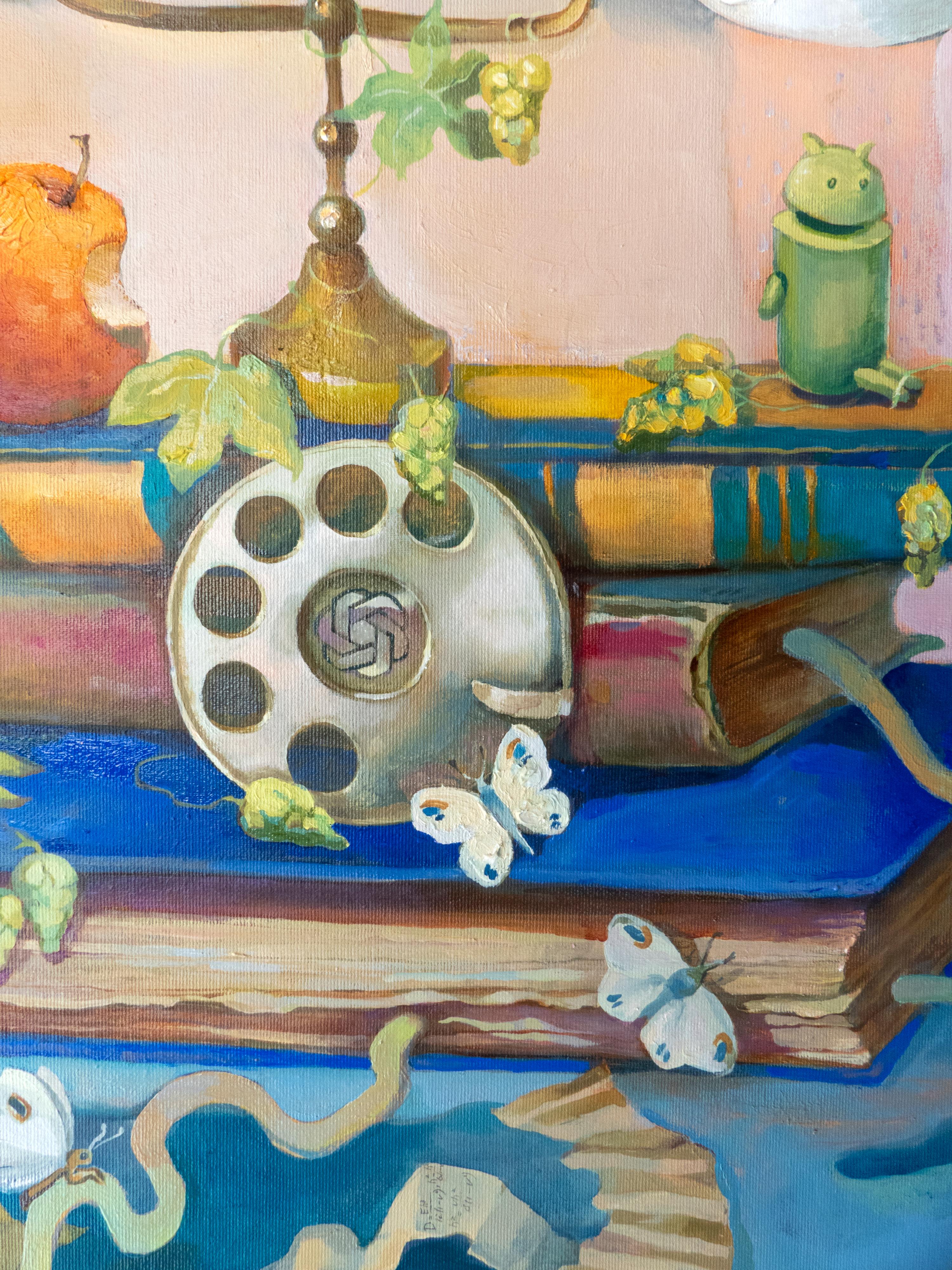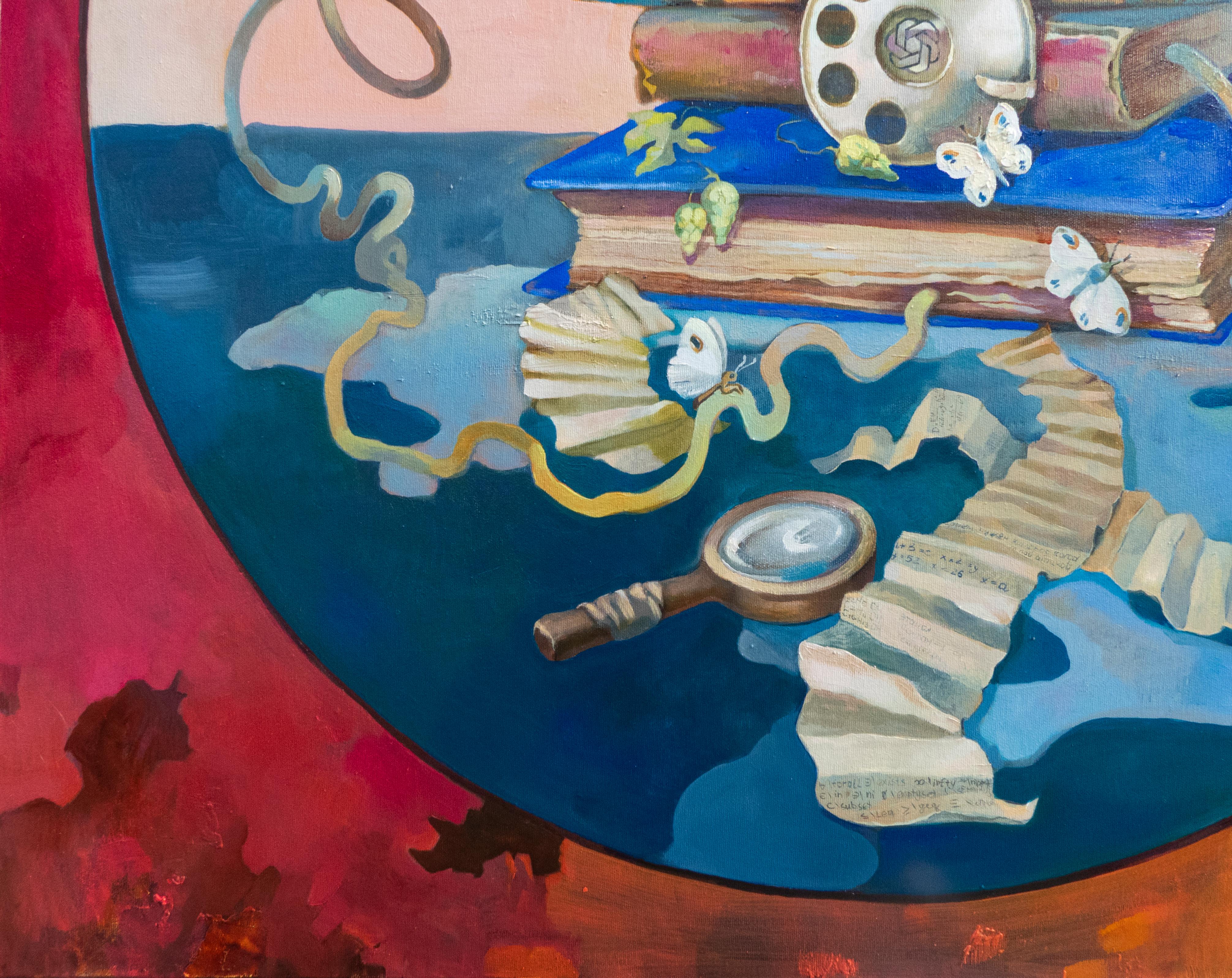 Als ich mit dieser Arbeit begann, malte ich einen Apfel und einen Androiden - Symbole für zwei gegensätzliche Welten, in die sich die Menschheit geteilt hat. Dennoch fühlte sich die Komposition unvollständig an, bis ich das Emblem von ChatGPT in der Mitte hinzufügte. Für mich stellt es den neuen Kern der Bildung und der Selbsterziehung dar - ein Symbol dafür, wie Technologie und menschliche Neugier jetzt ineinandergreifen, um unser gemeinsames Verständnis von Wissen zu gestalten.
