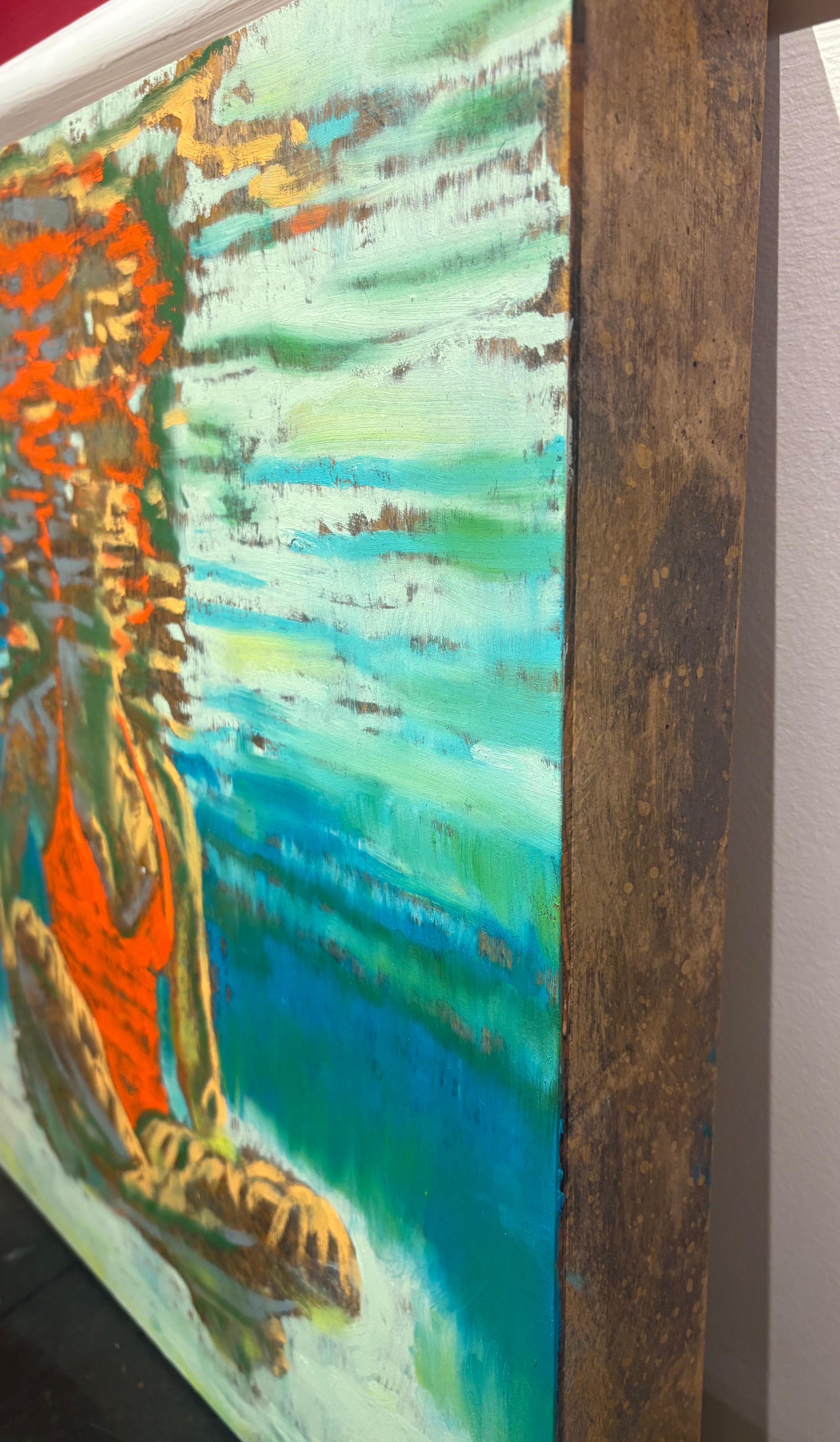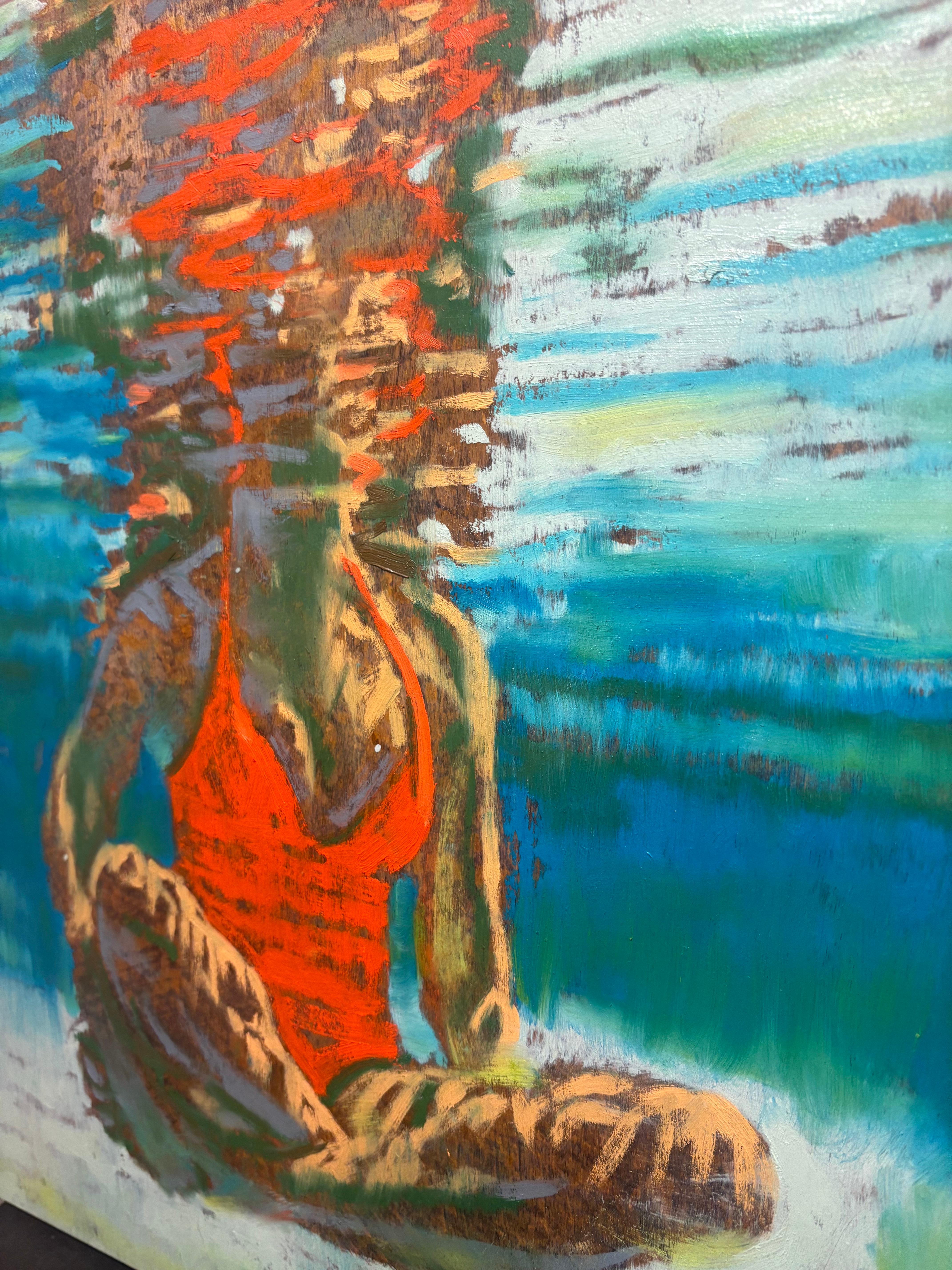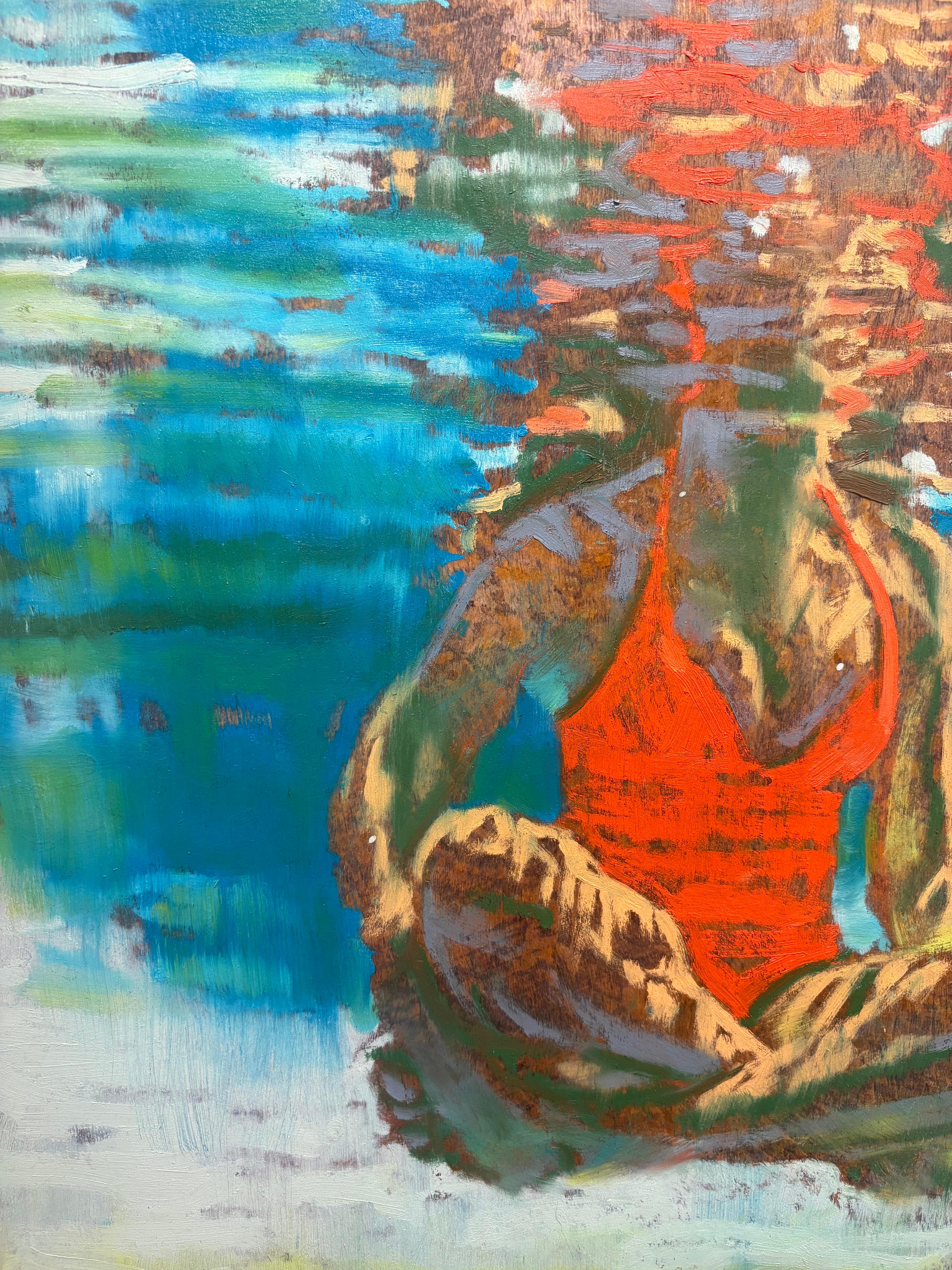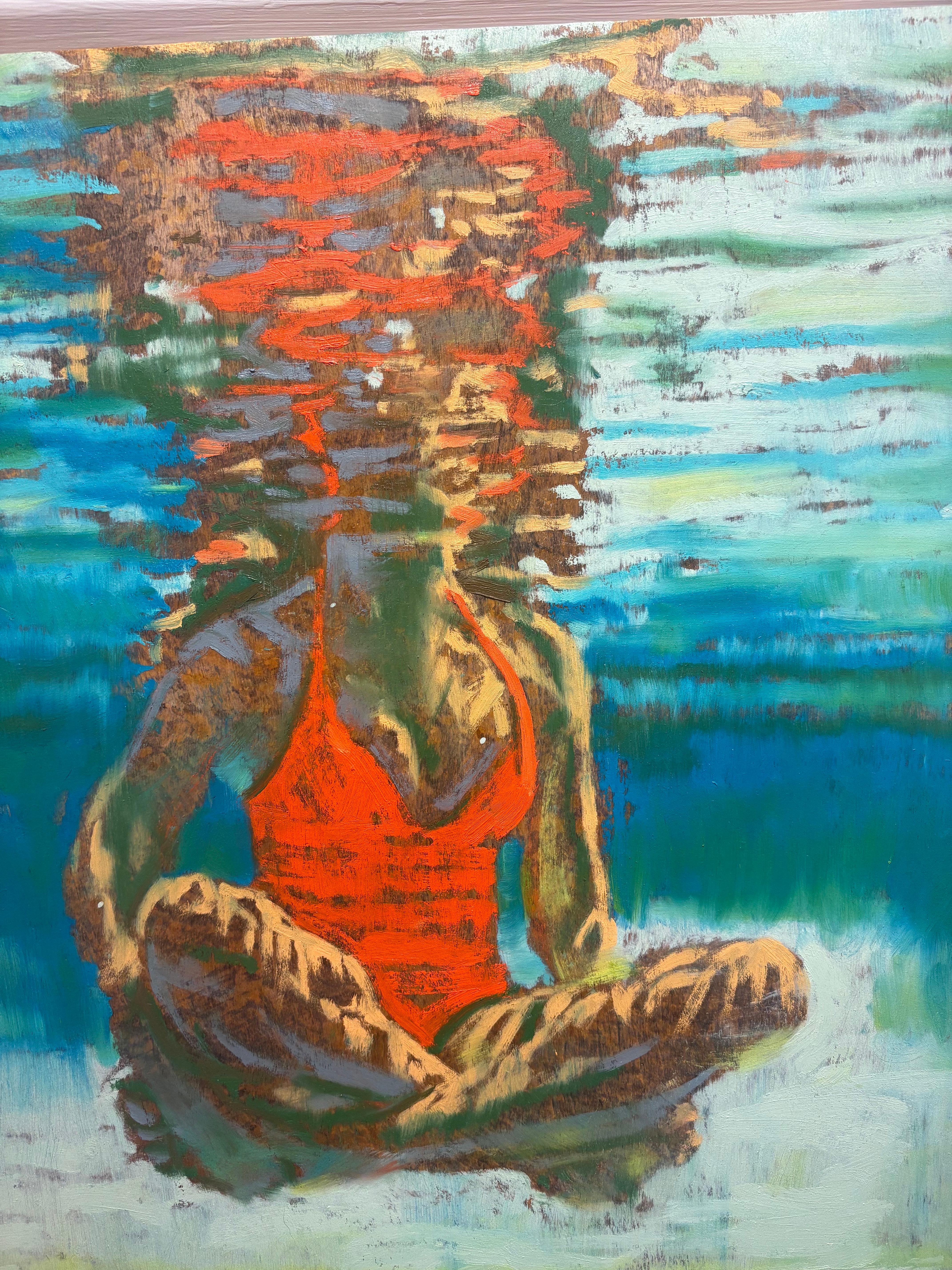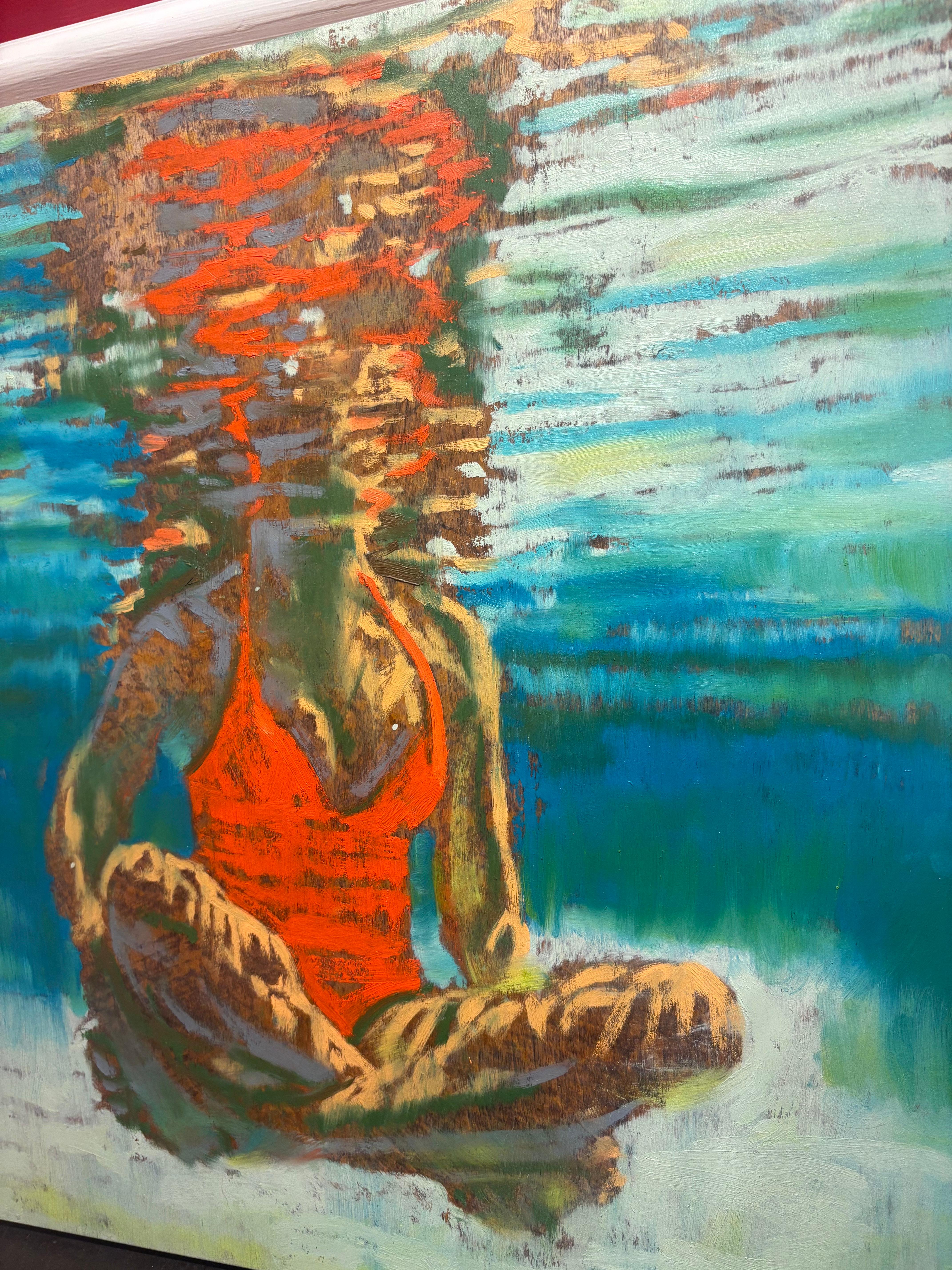 Carol Bennett"Water Lotus" Ölgemälde einer Frau in Orange, die in grünem Wasser schwimmt2025