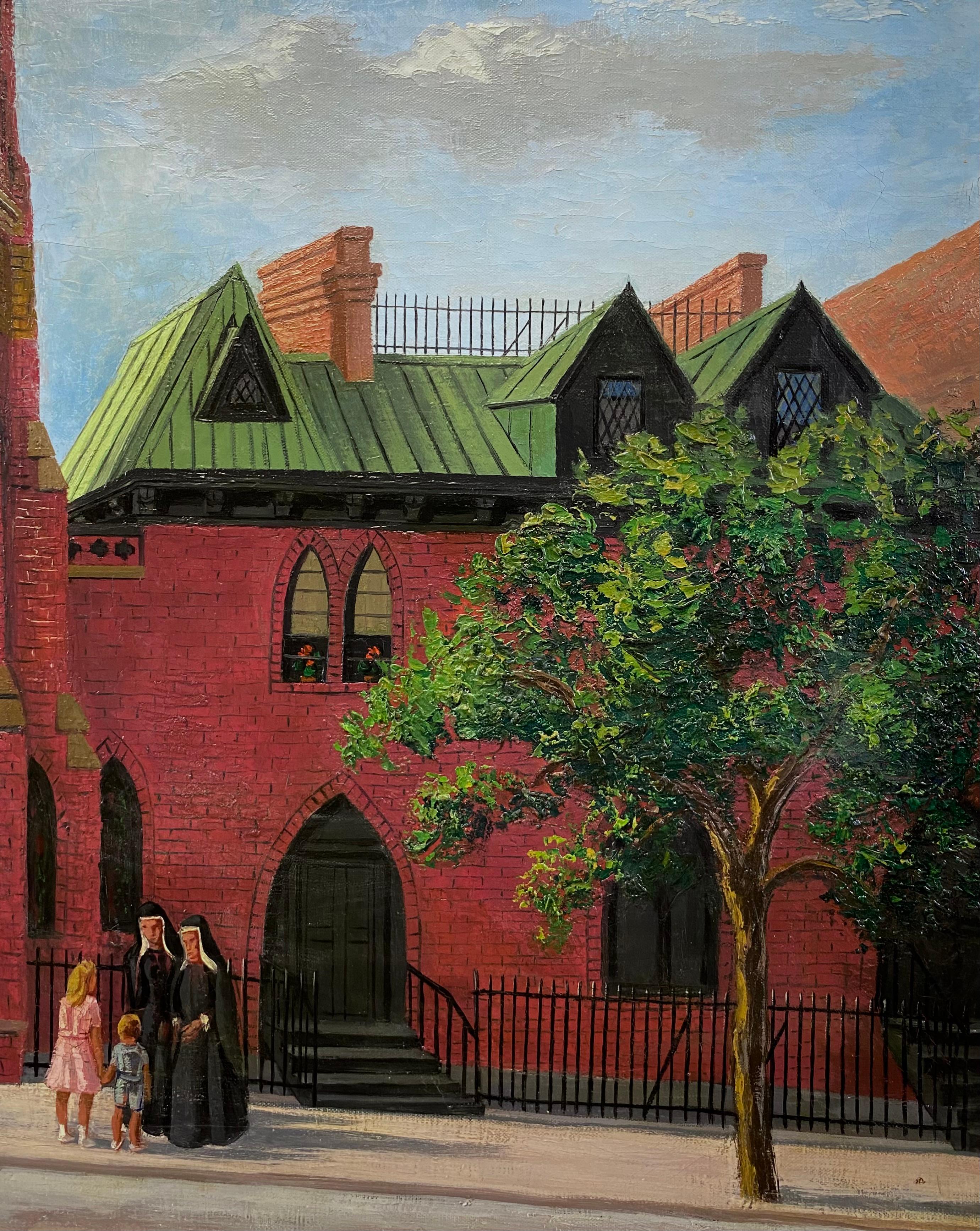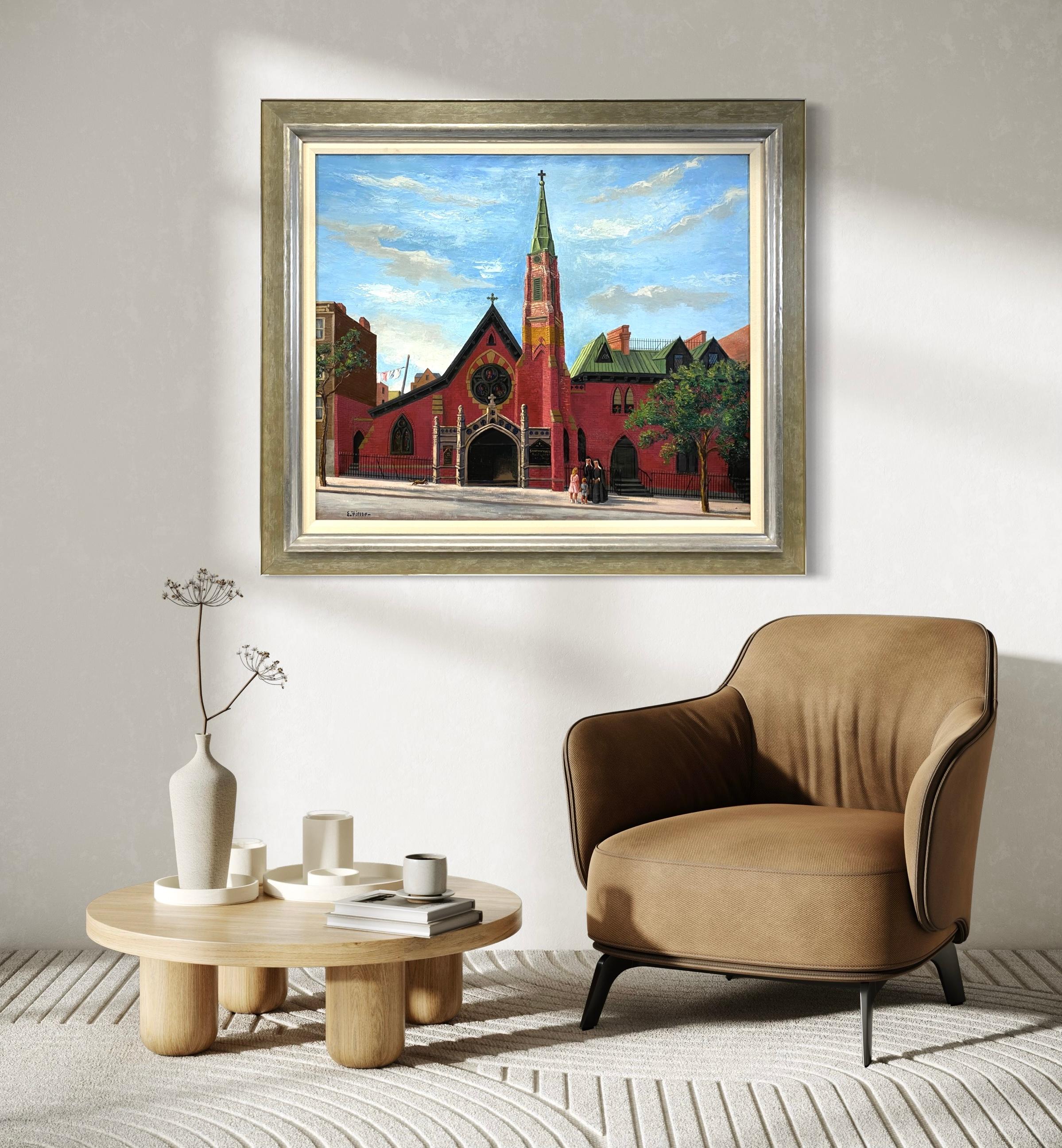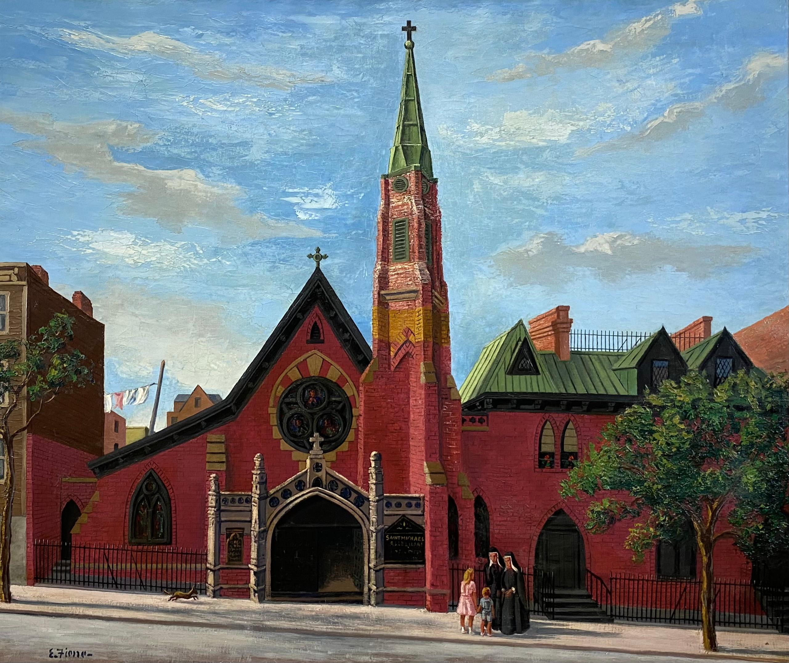 New York City war eine unerschöpfliche Inspirationsquelle für Fiene, der oft Straßenszenen wie diese in Brooklyn festhielt. Hier konzentriert sich Fiene auf eine Backsteinkirche im gotischen Stil mit einem markanten Kirchturm, ein Bild, das er in einem anderen Gemälde und einer Lithografie mit demselben Titel wiederholen wird.