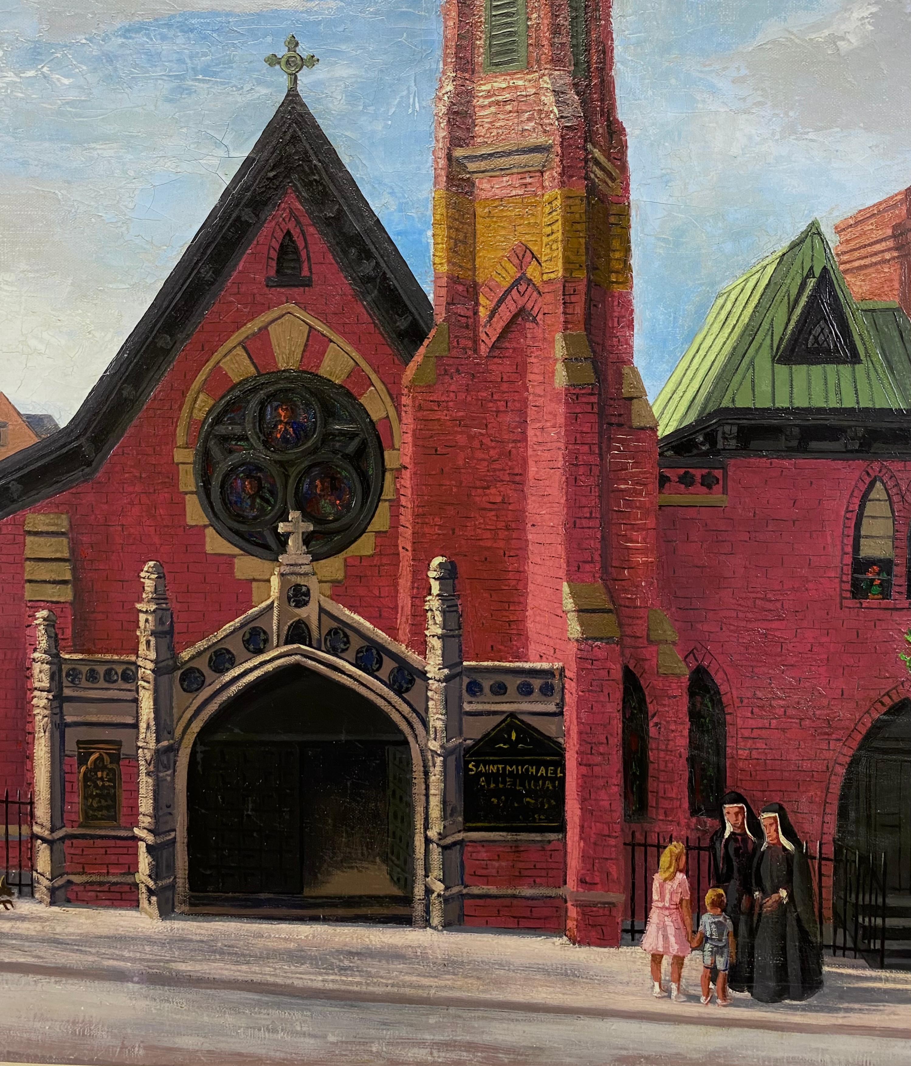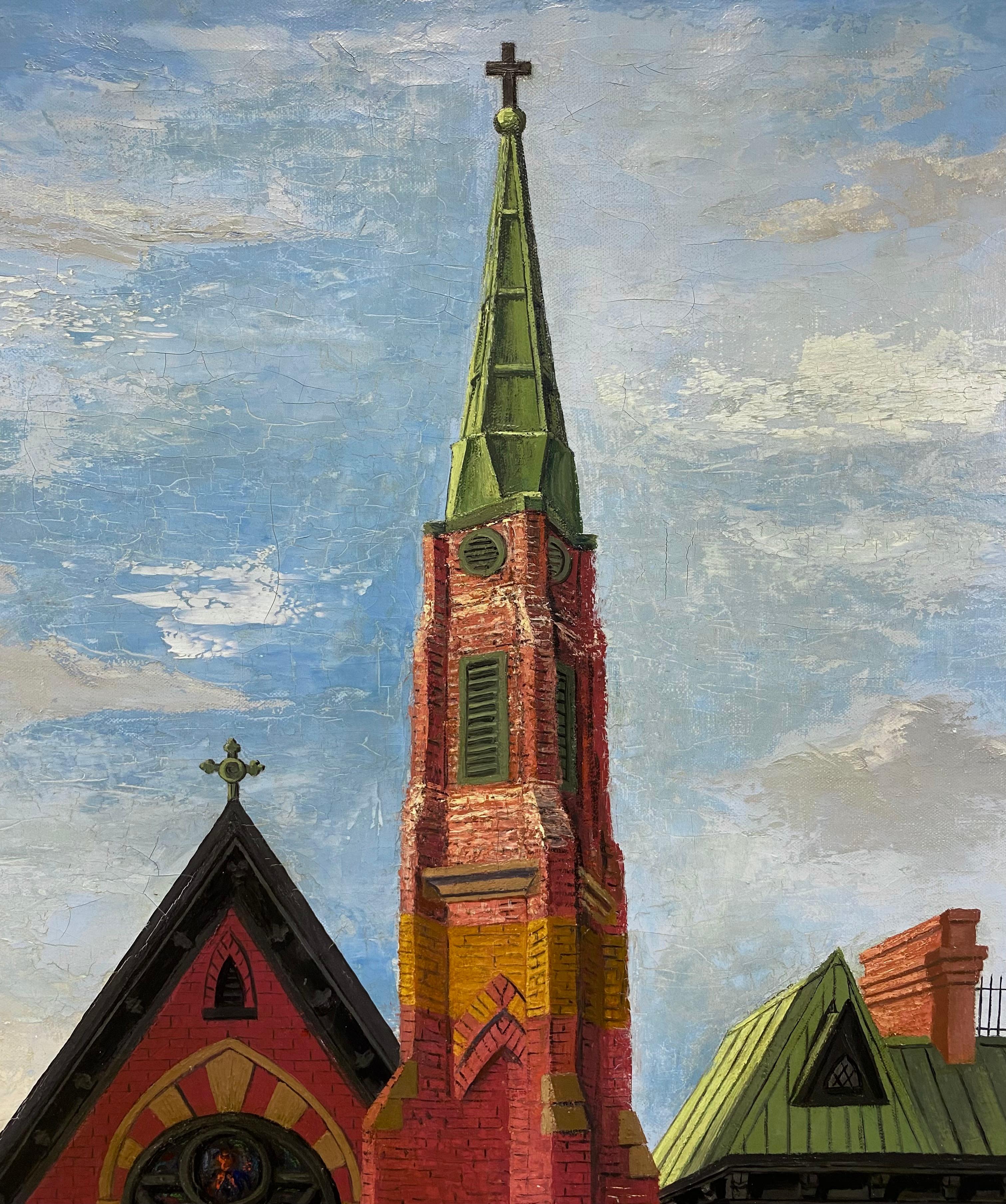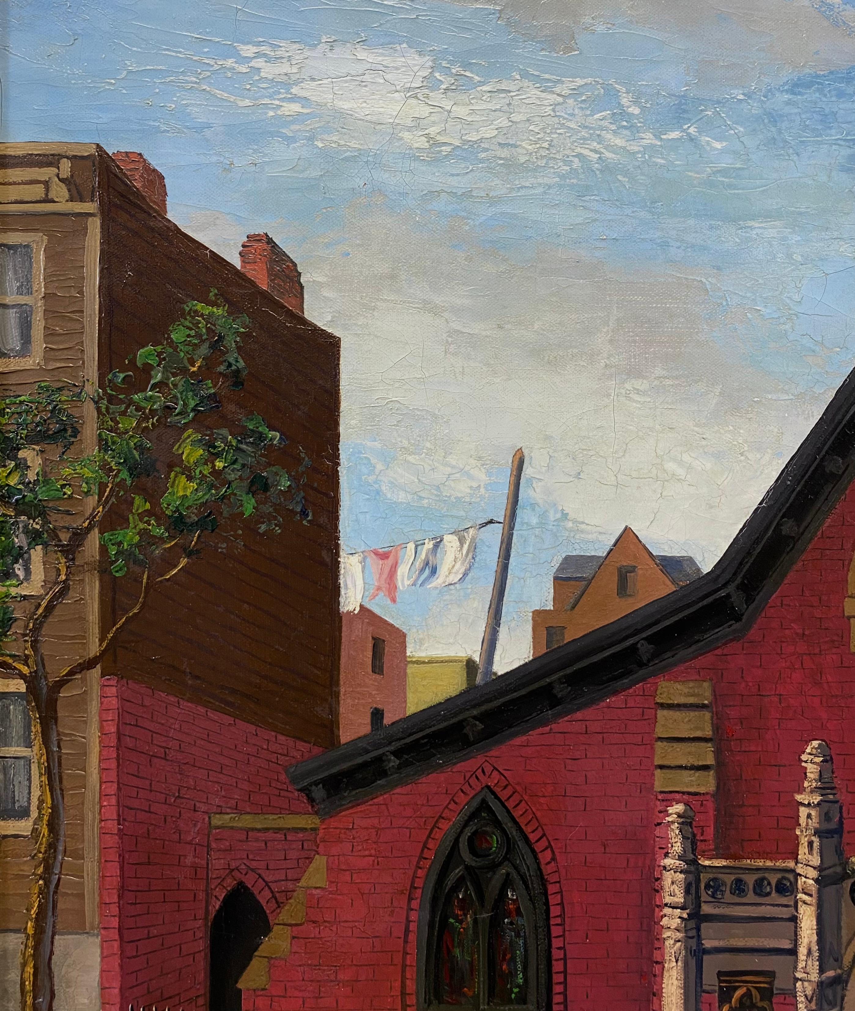 New York City war eine unerschöpfliche Inspirationsquelle für Fiene, der oft Straßenszenen wie diese in Brooklyn festhielt. Hier konzentriert sich Fiene auf eine Backsteinkirche im gotischen Stil mit einem markanten Kirchturm, ein Bild, das er in einem anderen Gemälde und einer Lithografie mit demselben Titel wiederholen wird.