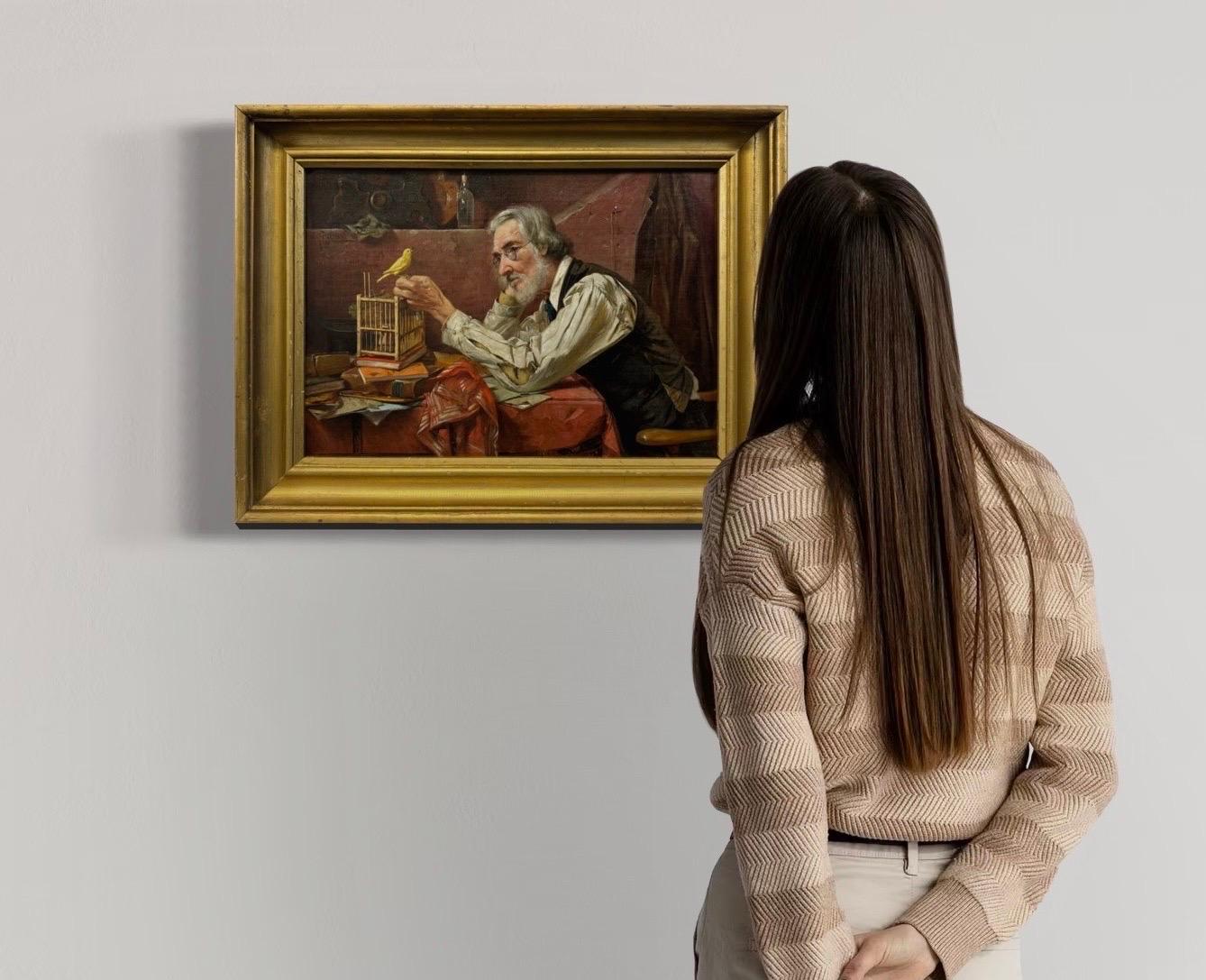 Ölgemälde der italienischen Schule des späten 19. Jahrhunderts – Junge und Budgerigar