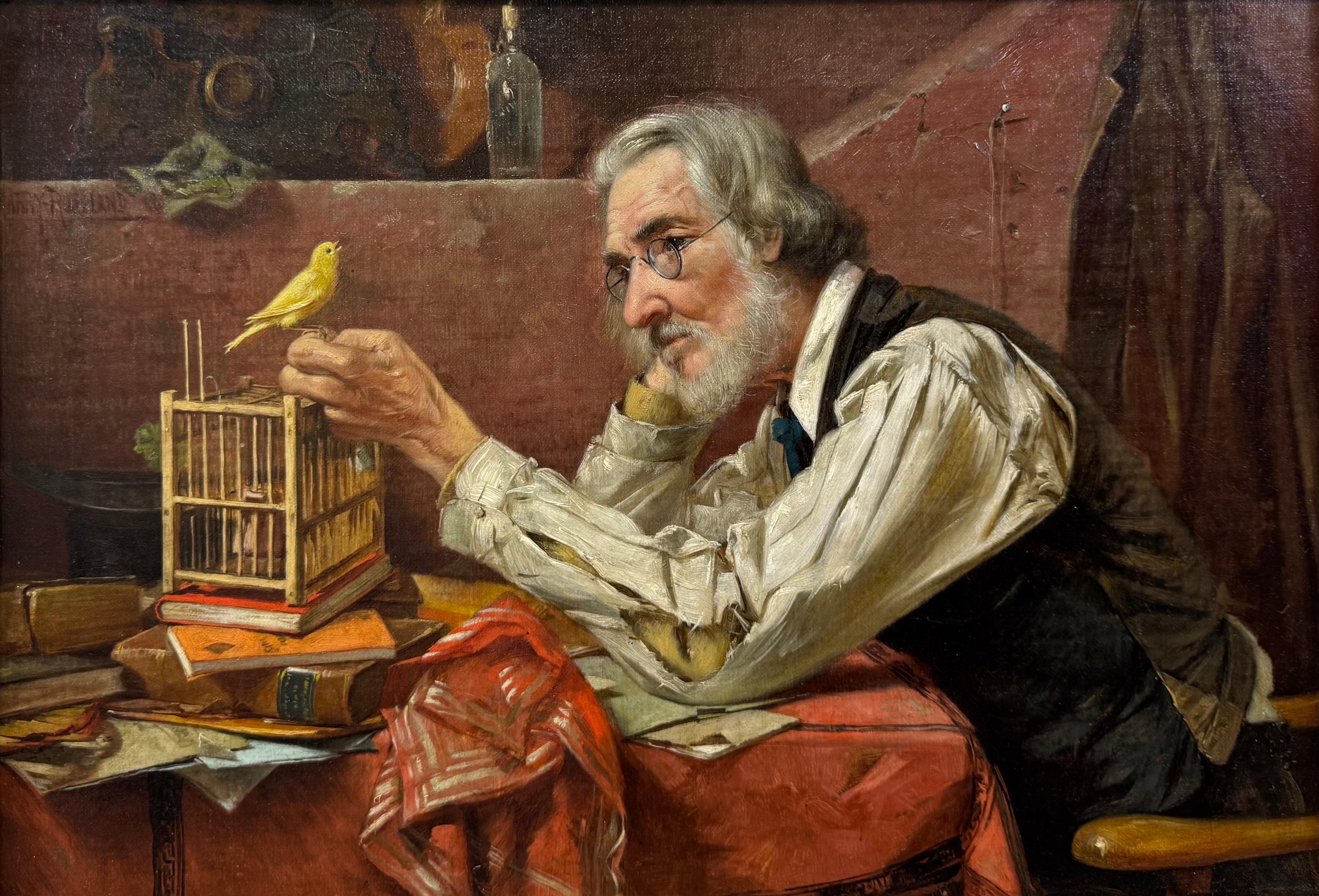Thematisch ist dieses Werk eine aufrichtige Meditation über Einsamkeit, Loyalität und das ständige Bedürfnis nach Verbindung. Um die Jahrhundertwende, als dieses Bild gemalt wurde, hatte die Gesellschaft mit den Auswirkungen der Industrialisierung und der Verstädterung zu kämpfen, wodurch die älteren Menschen oft an den Rand gedrängt wurden. Roseland, der sich in seinem Werk einfühlsam mit sozialen Erzählungen und dem alltäglichen Leben auseinandergesetzt hat, präsentiert diesen zutiefst persönlichen Moment. Er bietet ein schonungsloses und doch zärtliches Porträt der menschlichen Widerstandsfähigkeit - der vorsichtige Umgang des Mannes mit dem Vogel deutet darauf hin, dass selbst in der Isolation eine angeborene menschliche Fähigkeit zur Fürsorge und Zuneigung vorhanden ist.