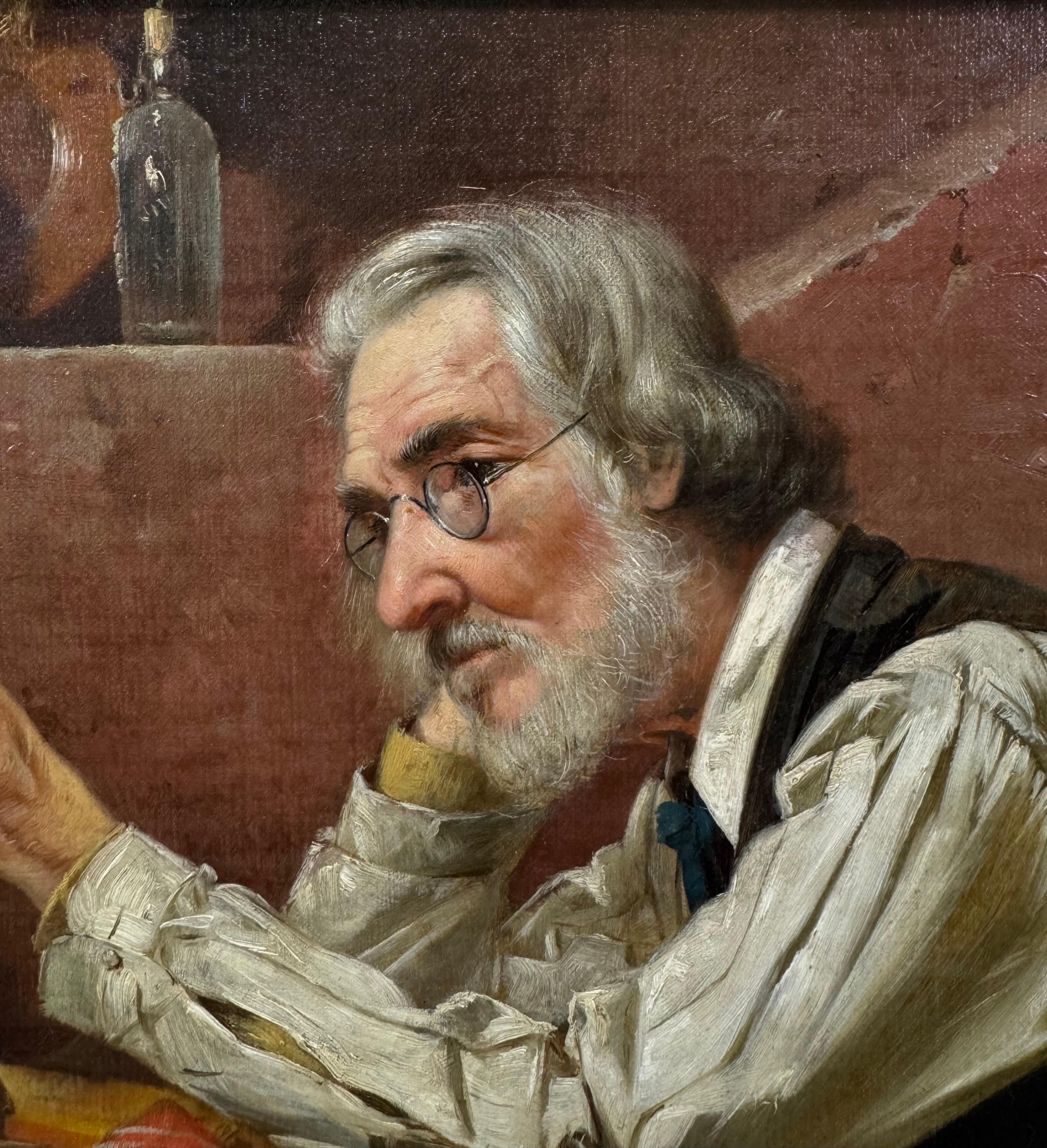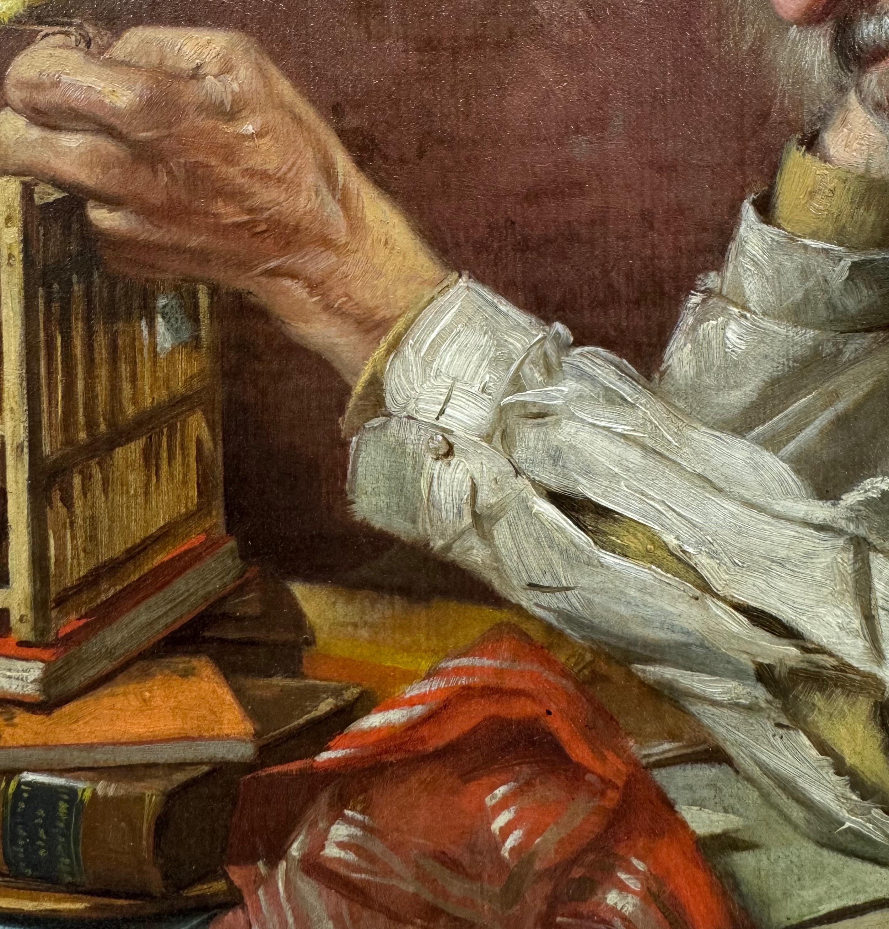 Roselands technisches Können zeigt sich in den sorgfältigen Texturen, die er in der gesamten Komposition erzielt. Die Falten des zerknitterten und zerrissenen weißen Hemdes des Mannes, der Glanz seiner Brille, die Rauheit der abgenutzten Bücher und verstreuten Papiere - all das ist mit einem taktilen Realismus gemalt, der den Betrachter in die Szene hineinzieht. Die erdige Farbpalette, die von gedämpften Rot-, Braun- und Ockertönen dominiert wird, hüllt die Komposition in eine düstere Atmosphäre. Jeder Gegenstand in diesem Raum ist sorgfältig ausgewählt, um ein Gefühl des stillen Verfalls zu erwecken: Die Stapel abgenutzter Bücher und Briefe, die gealterte Tischdecke und das schummrige, spärlich dekorierte Interieur zeugen von einem einstmals erfüllten Leben, das nun verkümmert ist.
