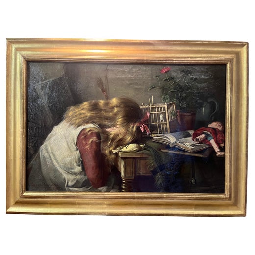 Ein wunderbares Beispiel für die beliebten Genreszenen von Roseland aus der Zeit um die Jahrhundertwende. Dieses Gemälde zeigt einen älteren Mann, der an einem unordentlichen Tisch sitzt und mit einem kleinen gelben Kanarienvogel, der auf seiner Hand sitzt, sanft interagiert. Roseland fängt einen starken Kontrast zwischen dem wettergegerbten, müden Aussehen des Mannes und der lebhaften, vibrierenden Energie des Vogels ein. Das ausdrucksstarke Gesicht des Mannes, das von Alter, Melancholie und Zärtlichkeit geprägt ist, wird von grauen Haarsträhnen und einer dünnen Brille auf der Nase eingerahmt. Seine zusammengesunkene Haltung und sein in sich gekehrter Blick deuten auf seine Einsamkeit hin und lassen vermuten, dass der Vogel vielleicht sein einziger verbliebener Begleiter ist, daher der Titel.