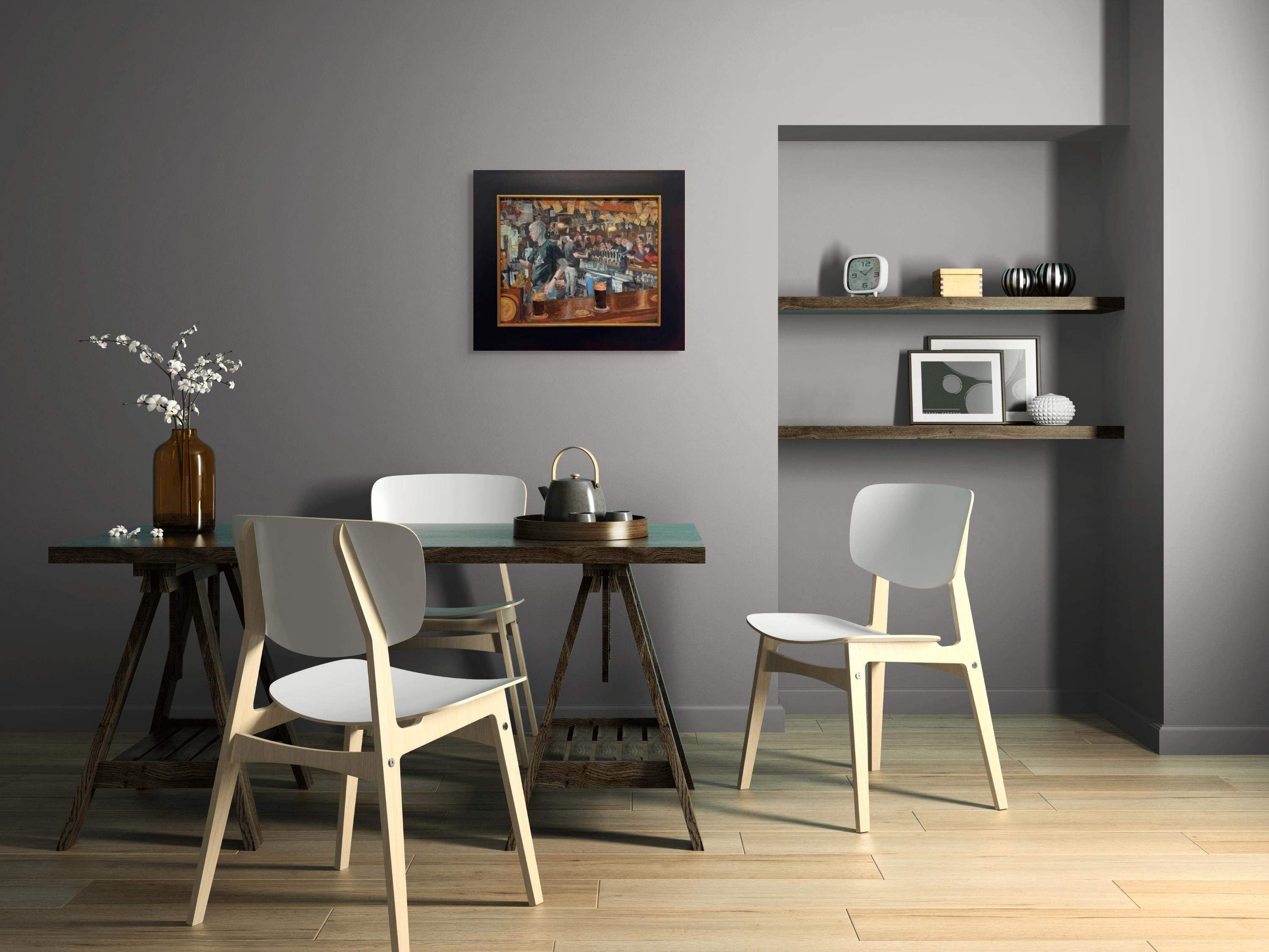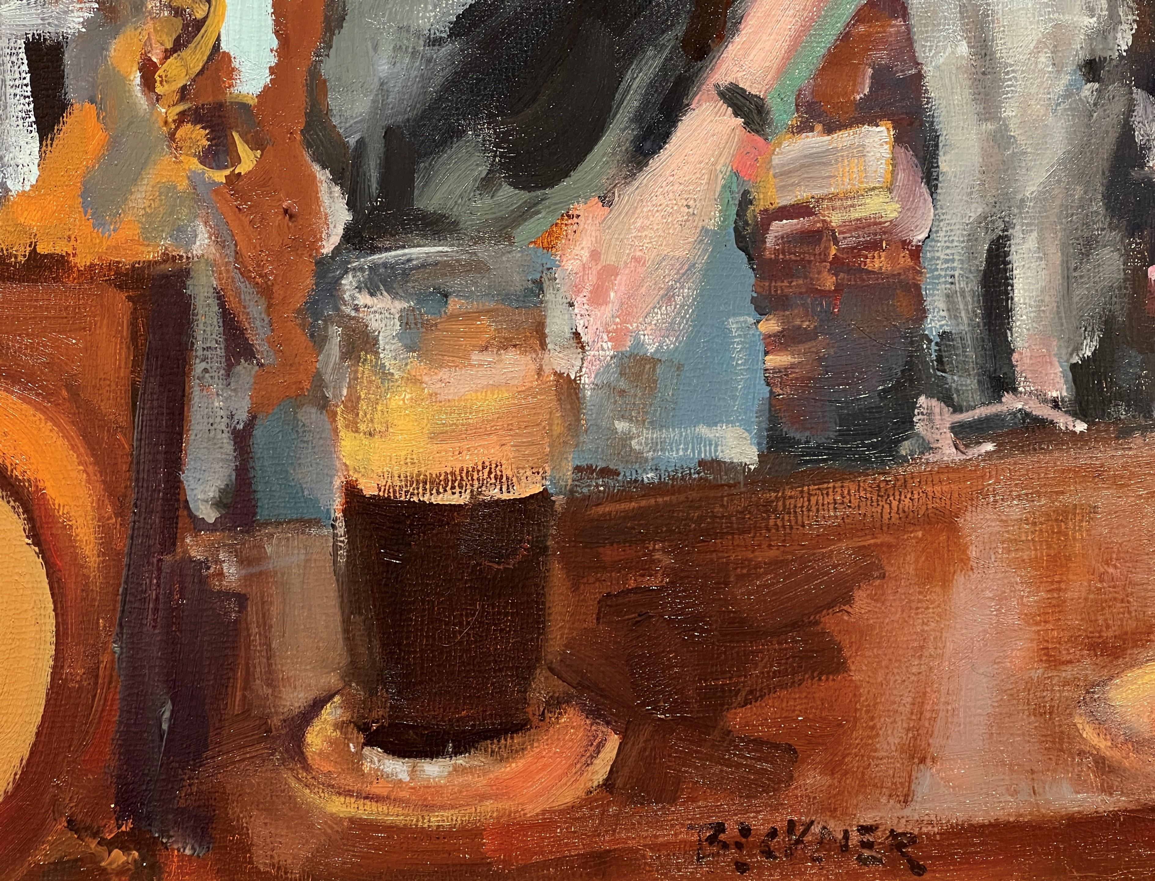 "Slow Pour" ist ein handgefertigtes expressionistisches Ölgemälde, das das warme Interieur einer belebten Kneipe zeigt.