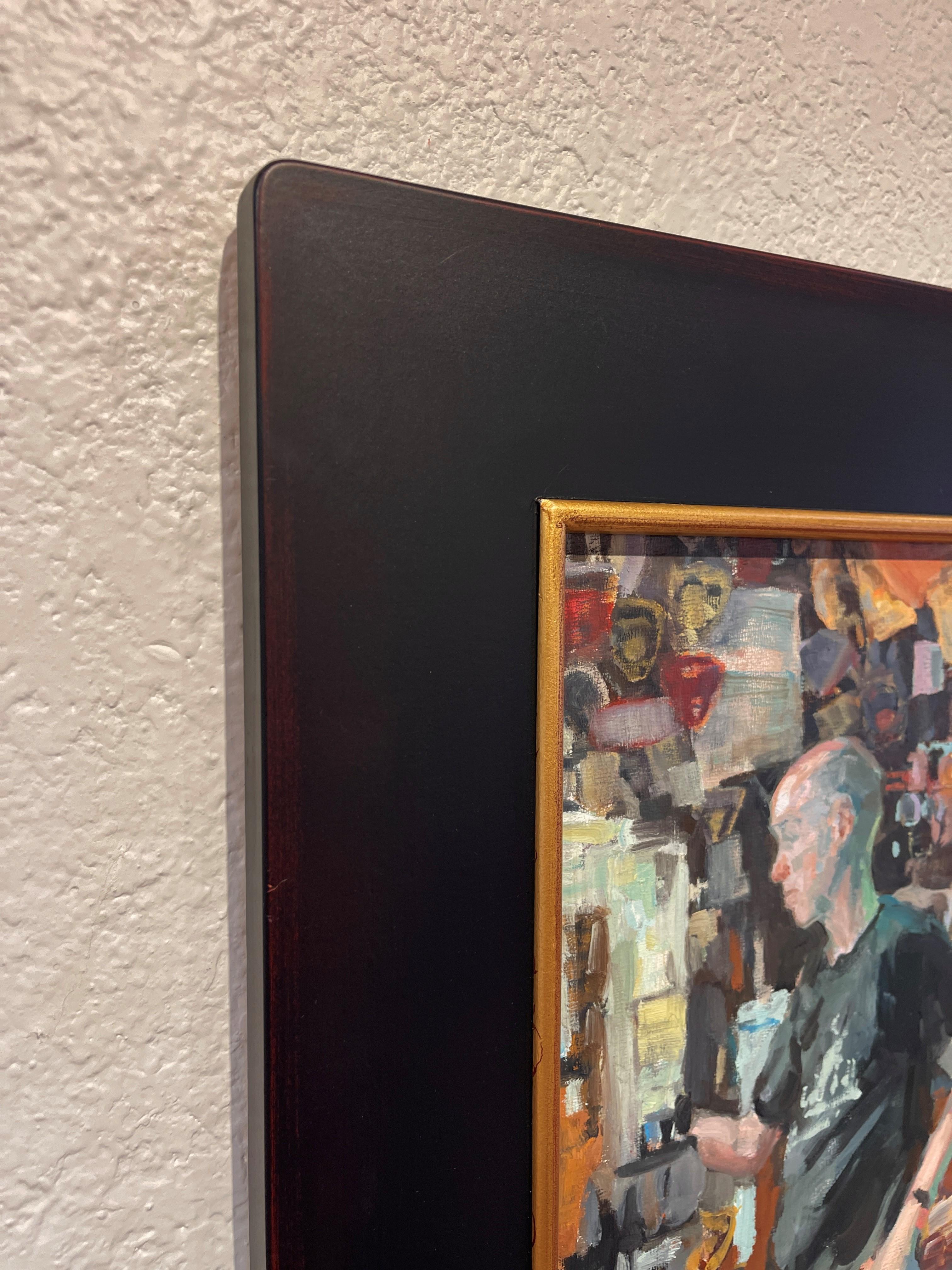 Dieses Gemälde ist 16 x 20 Zoll groß und wird in einem schwarzen Holzrahmen von 22,50 x 27 Zoll gerahmt, verdrahtet und hängefertig geliefert.