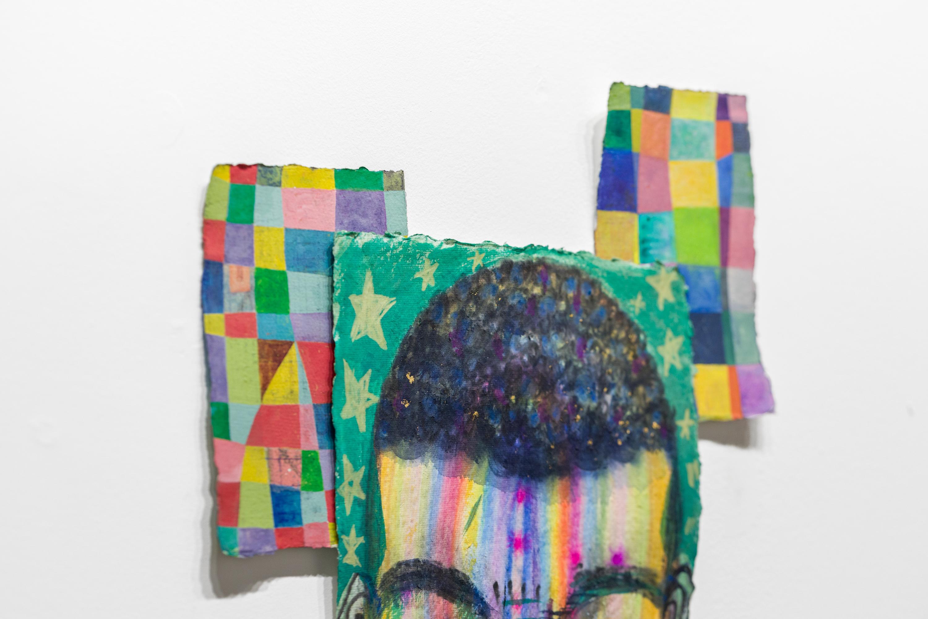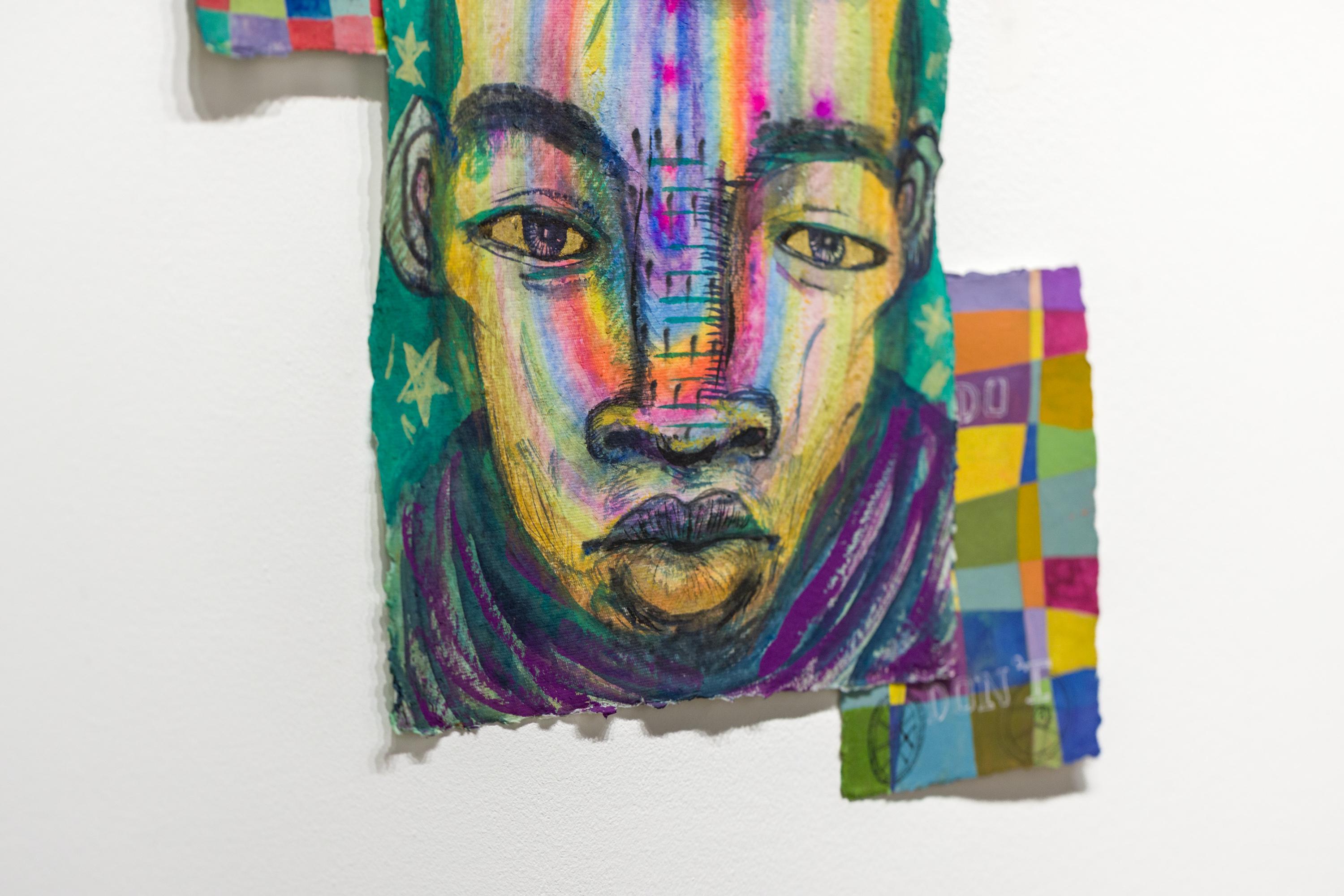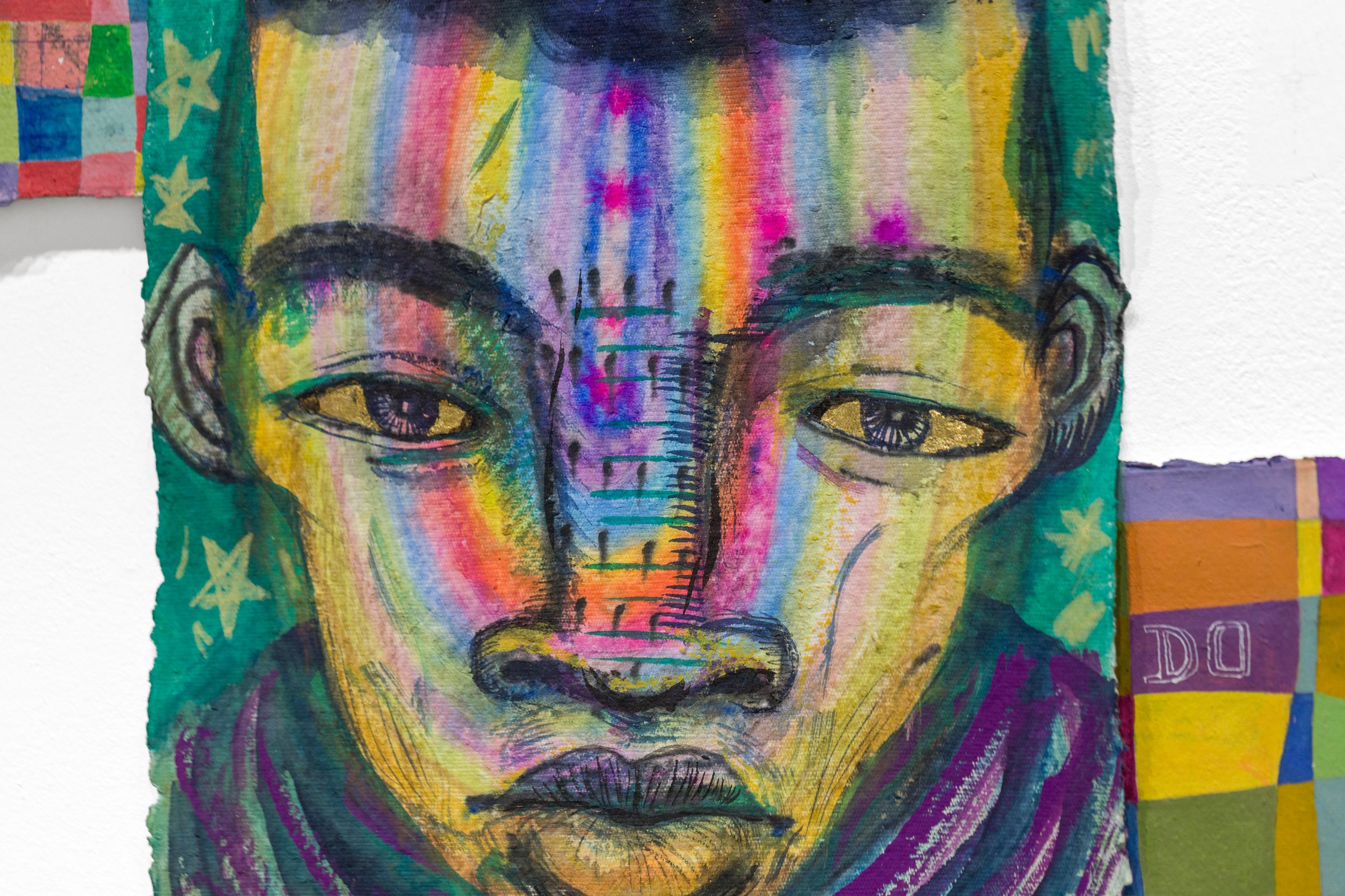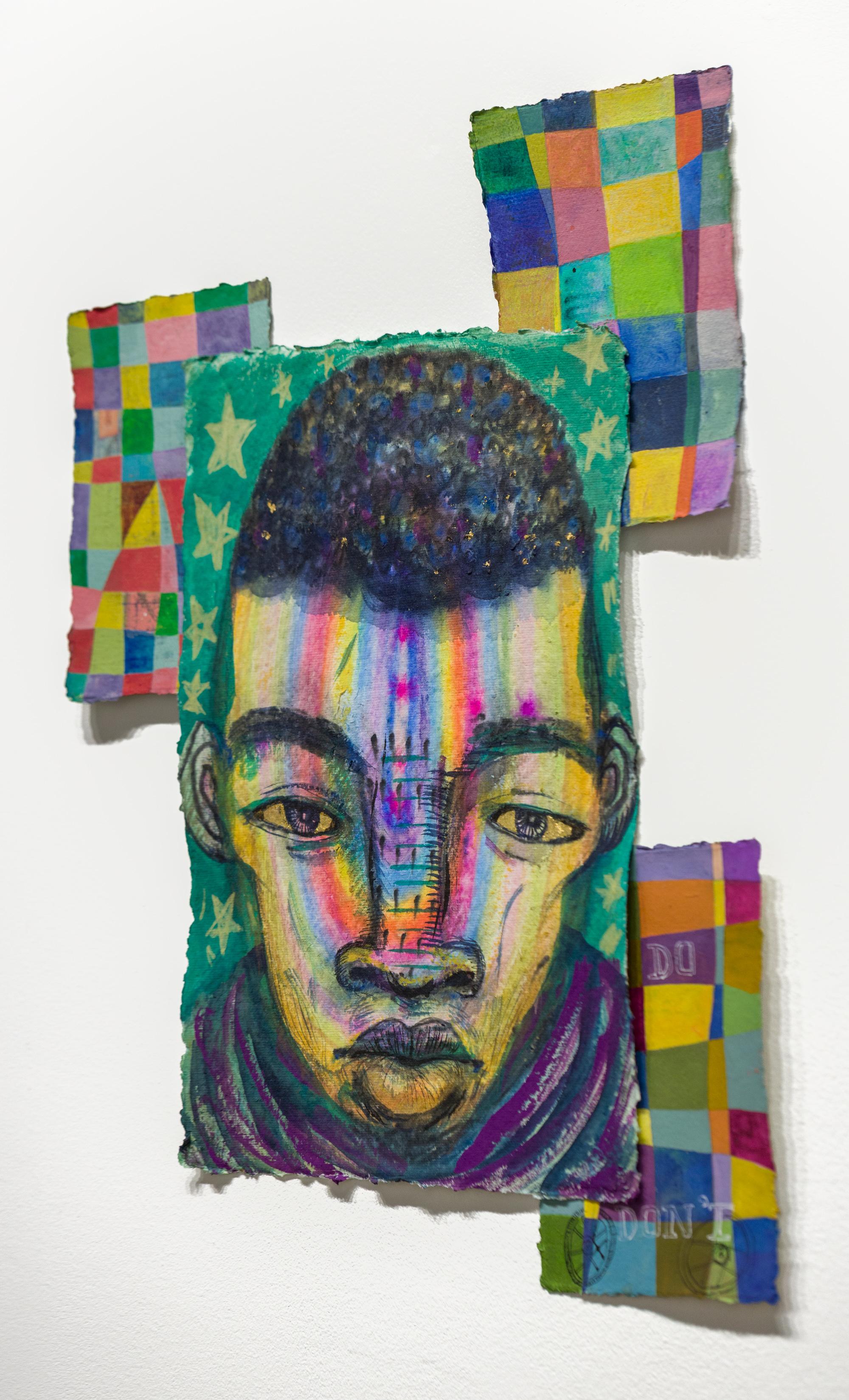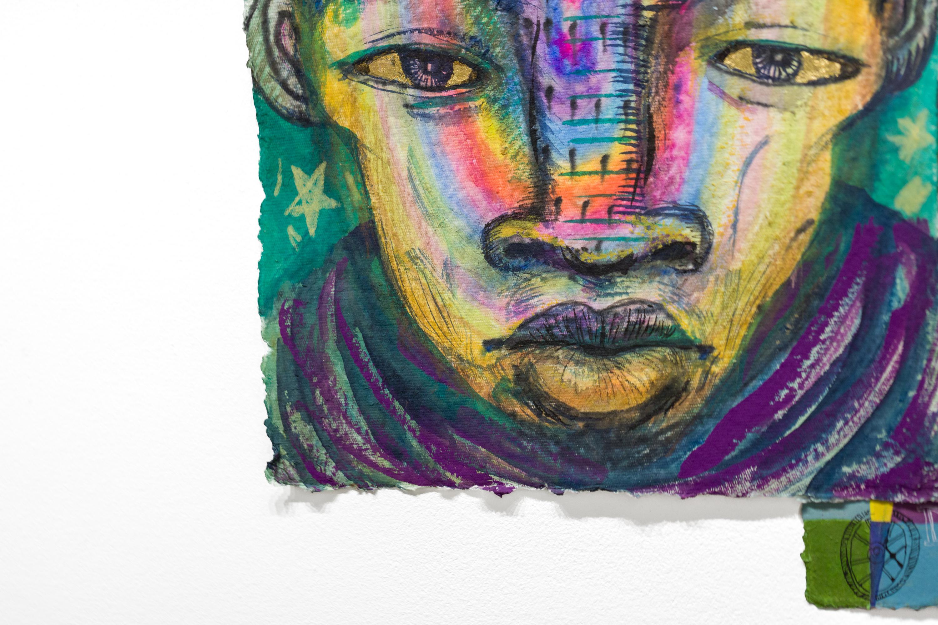"Herz eines Helden" ist ein originelles Quadriptychon von Kevin Snipes mit Tinte, Gouache, Acryl, Farbstift, Pastell und Blattgold auf Papier. Dieses Stück misst 22,5 "h x 19 "w und ist verso signiert.