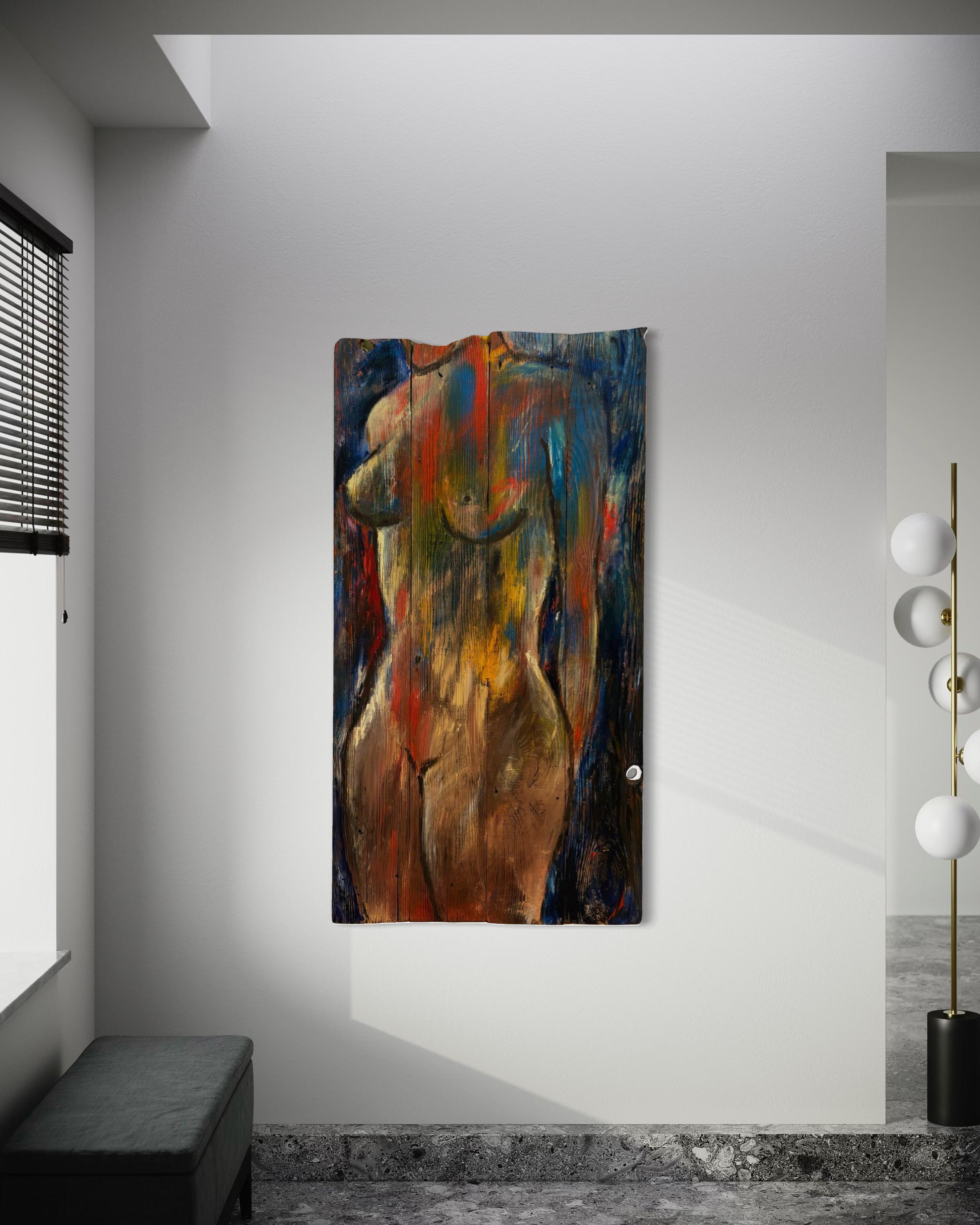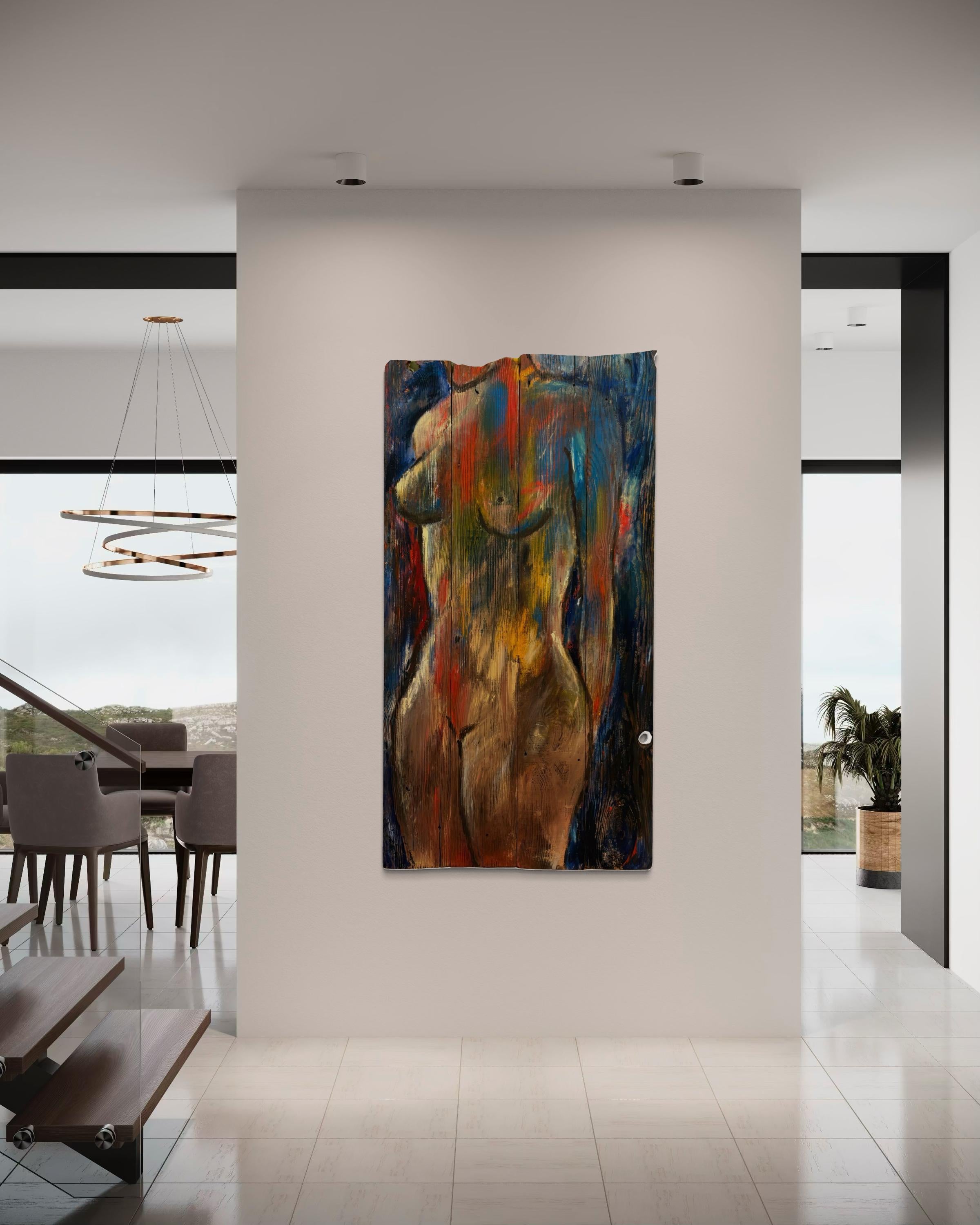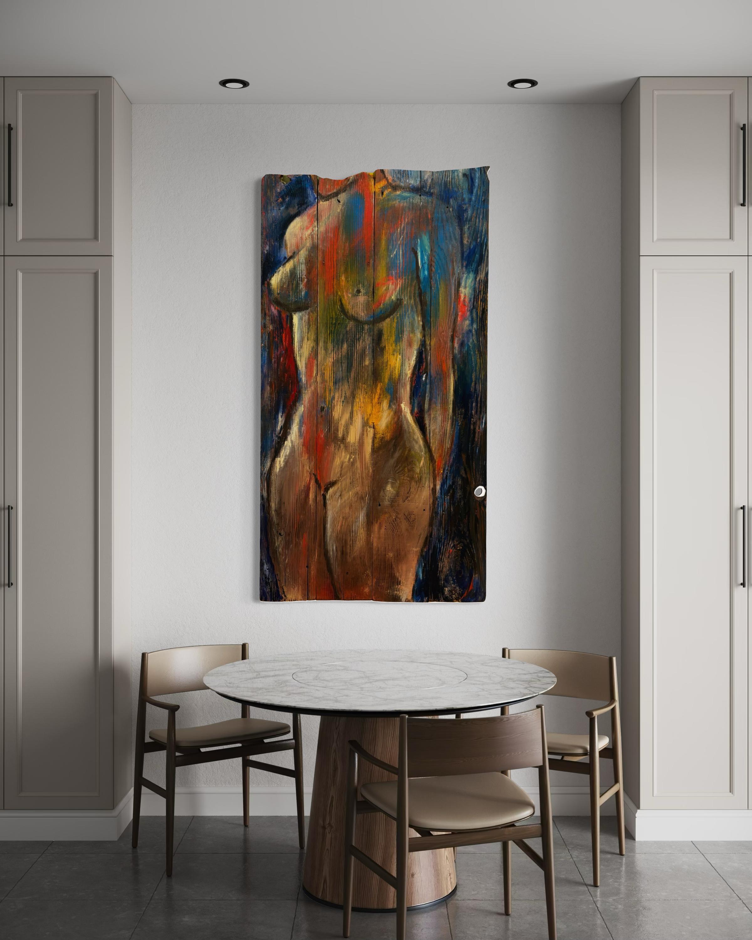 "Ambivalent" ist ein beeindruckendes, großformatiges Werk, gemalt in Öl auf wiederverwendetem Holz. Kristy Chettle verbindet die organische Textur der Holzoberfläche mit ausdrucksstarken Farben und Gesten und schafft so eine kraftvolle zeitgenössische Interpretation der menschlichen Form. Satte Schichten von Blau-, Rot-, Gelb- und Erdtönen ziehen sich über die Figur und vermischen Abstraktion und Figuration mit emotionaler Tiefe. Die natürlichen Äste und die Maserung des aufgearbeiteten Holzes atmen durch die Farbe hindurch, erden das Bild in der Materialgeschichte und verleihen dem Werk eine rohe, fühlbare Schönheit.